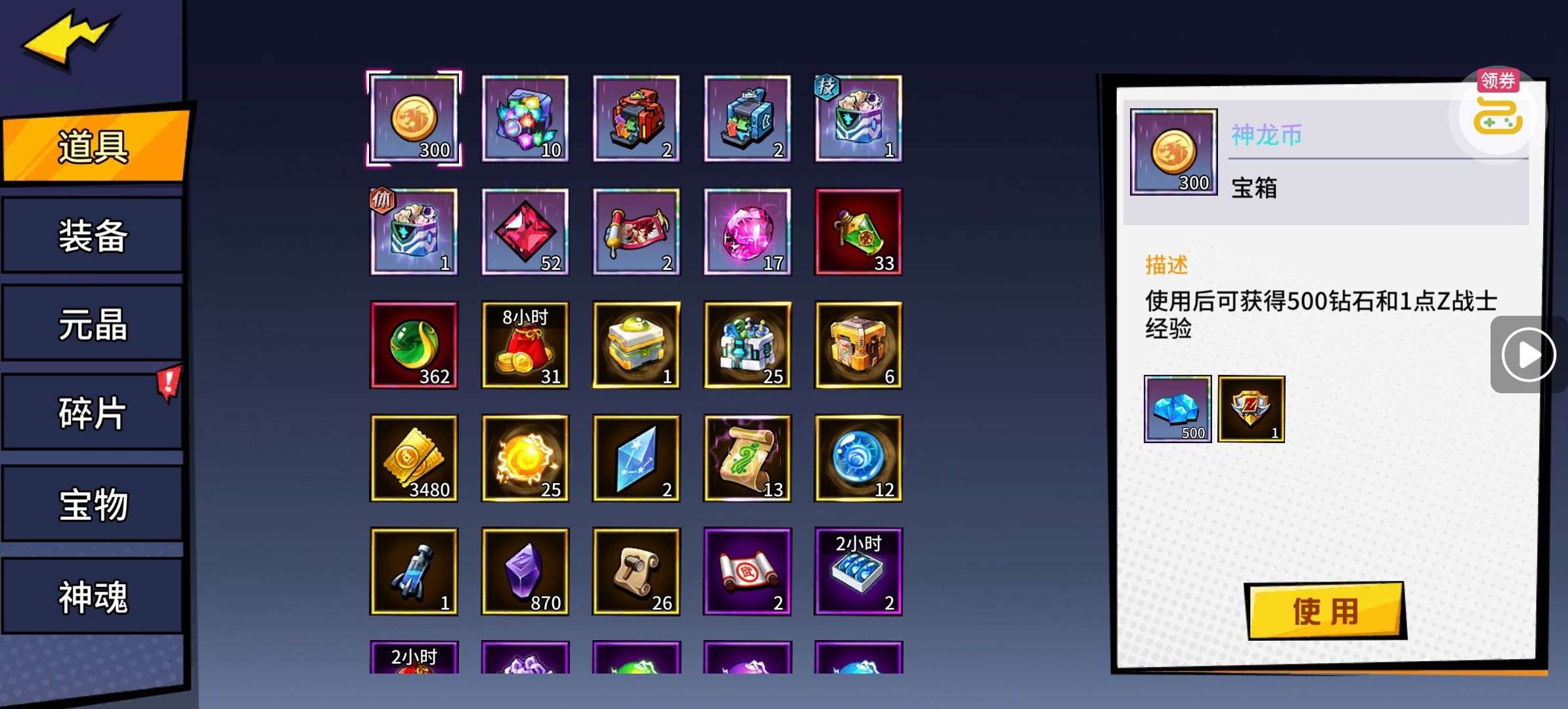 夺宝券*1、比武令*1、5星随机将魂*10(每个账号限领一次)