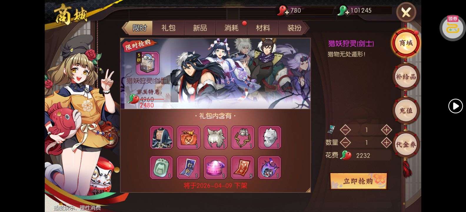 夺宝券*1、比武令*1、5星随机将魂*10(每个账号限领一次)