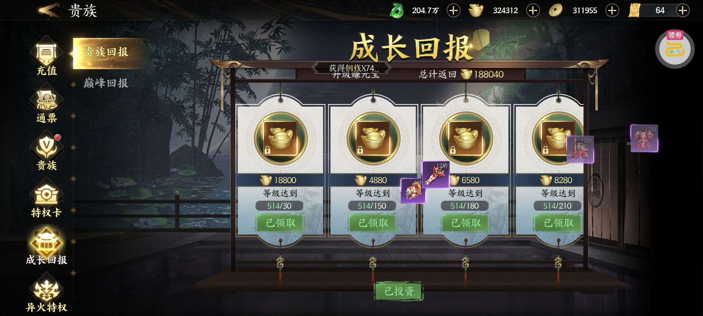 夺宝券*1、比武令*1、5星随机将魂*10(每个账号限领一次)