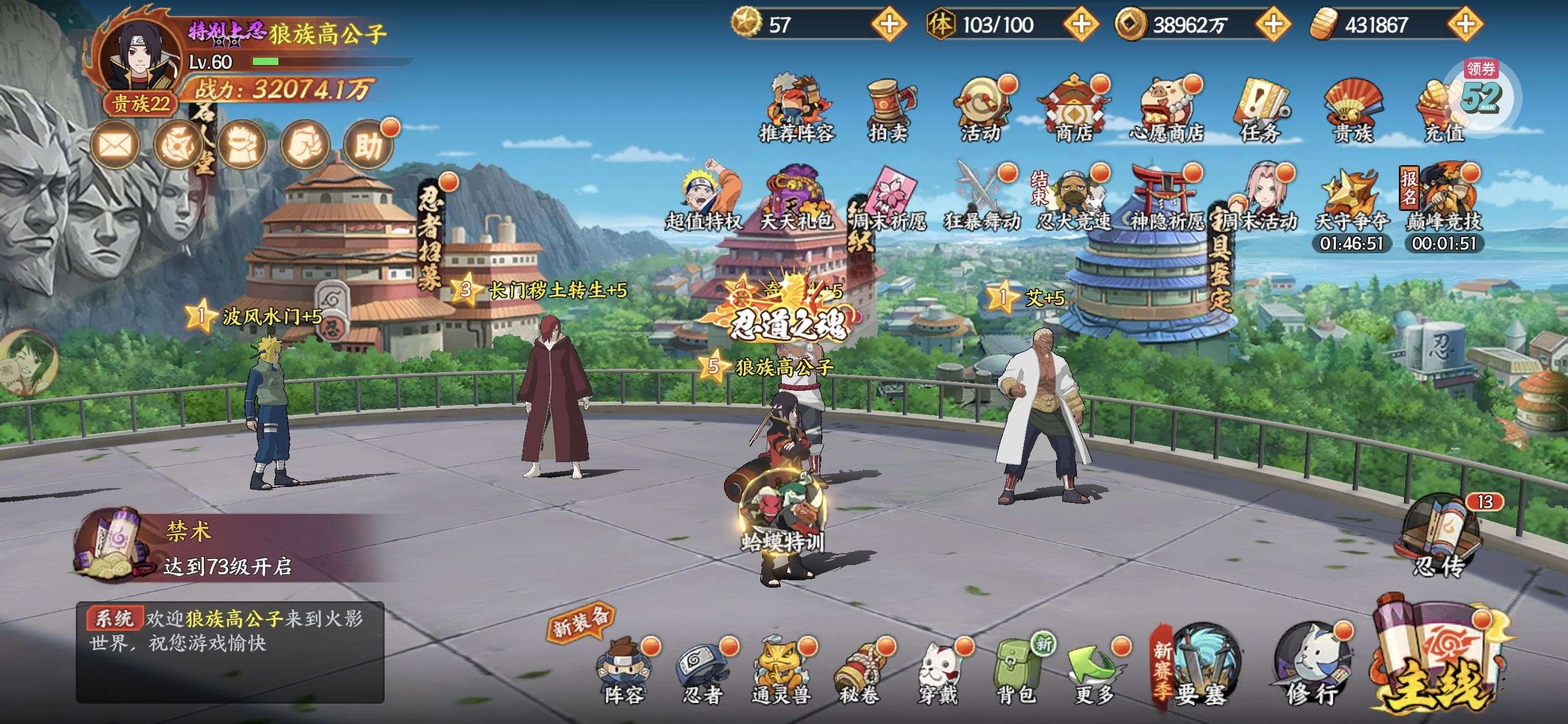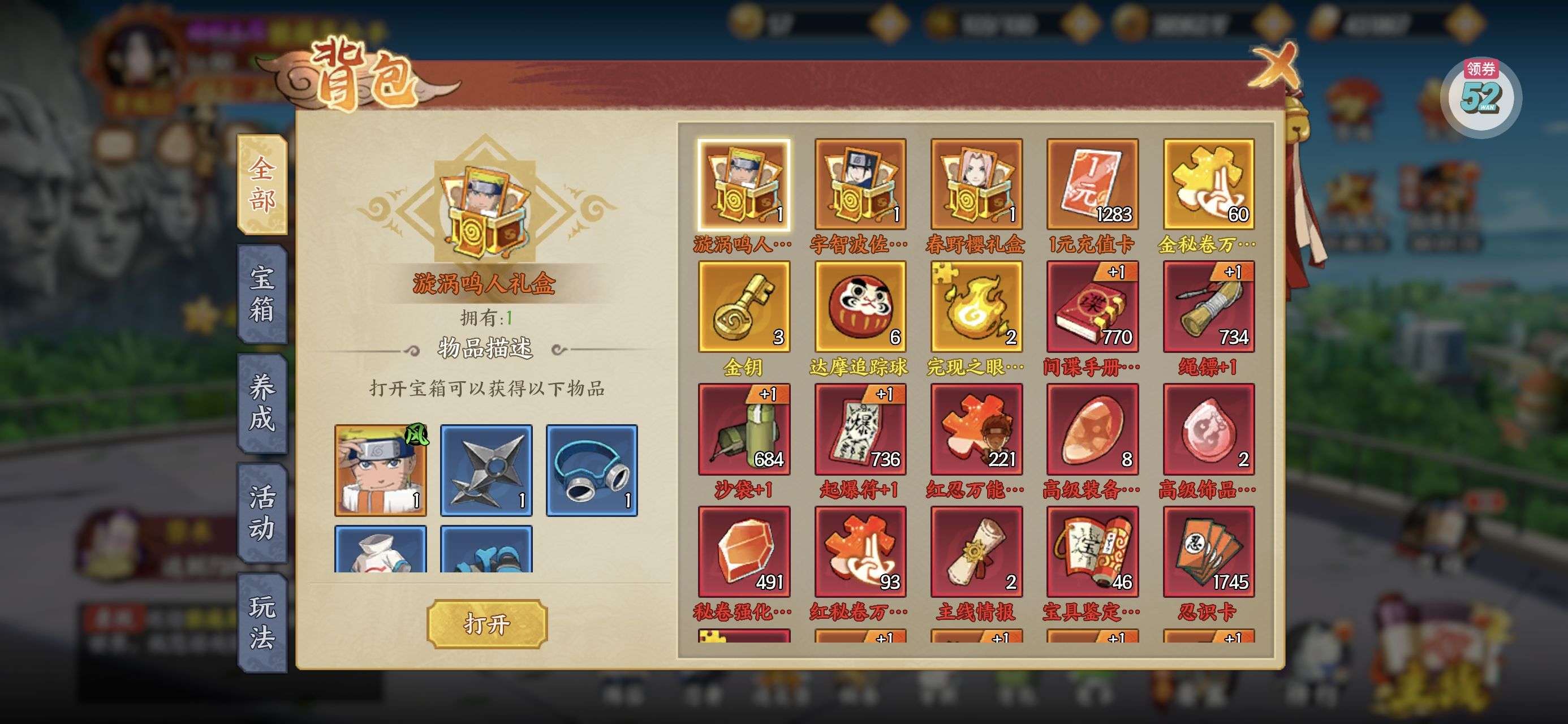 五阵营输出自选包*1、豪华材料自选礼包*2、高级忍法帖*20(每个账号限领一次)