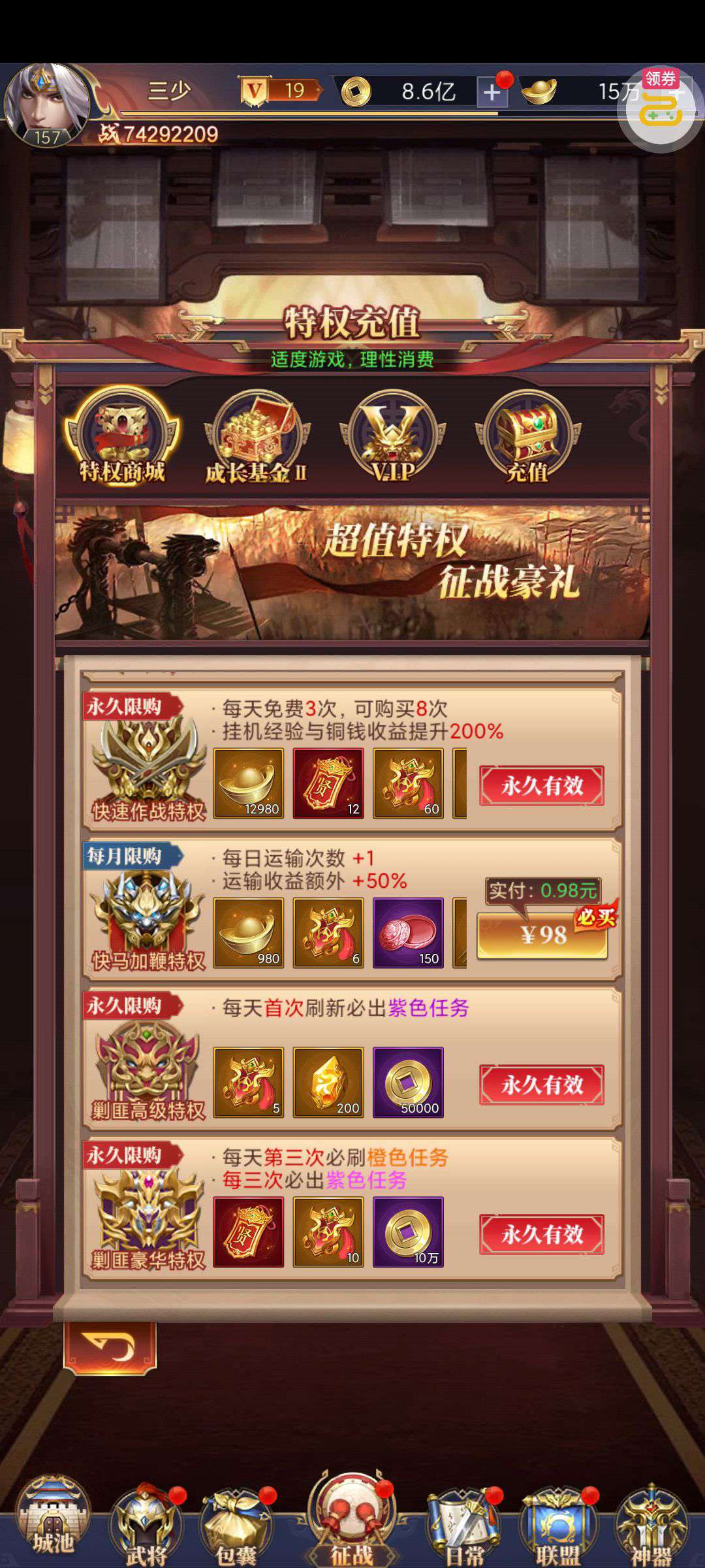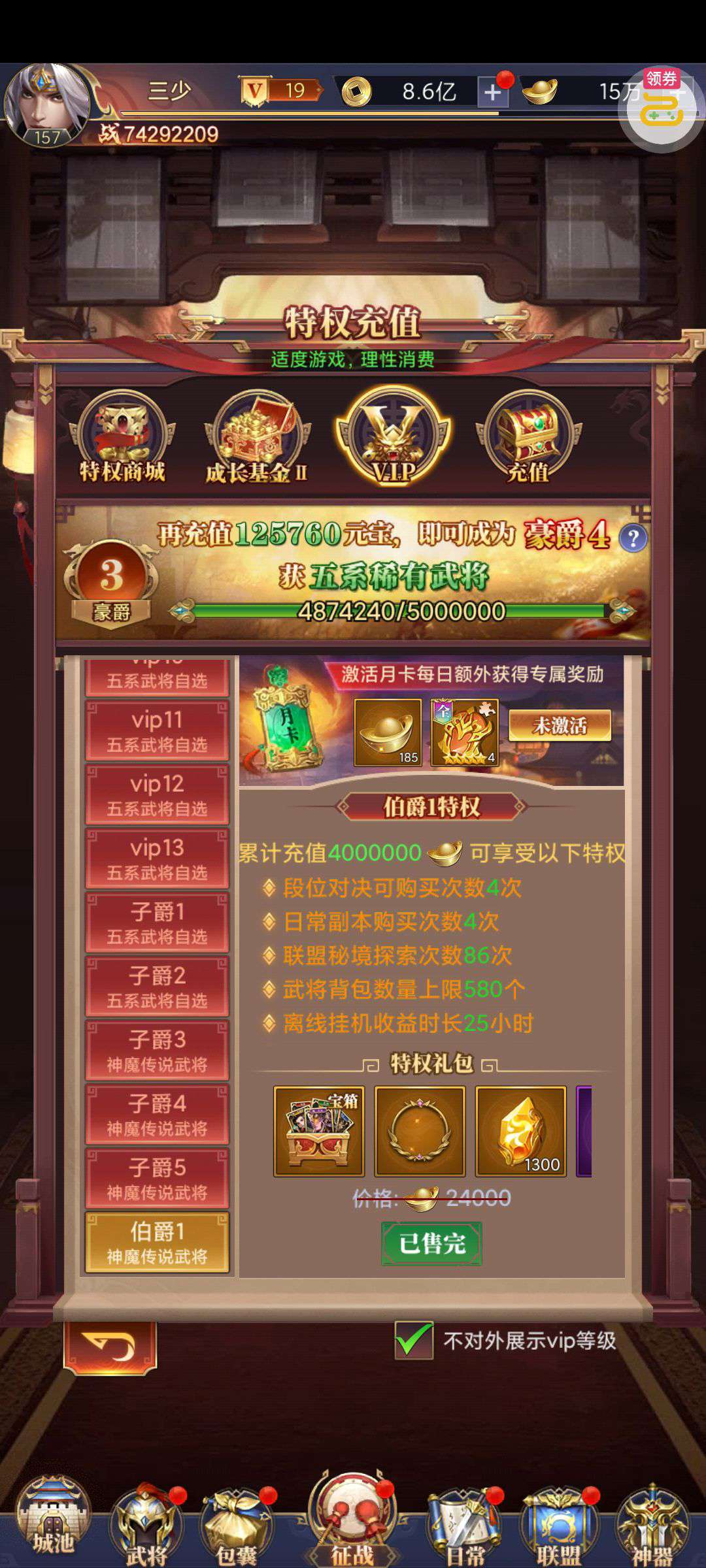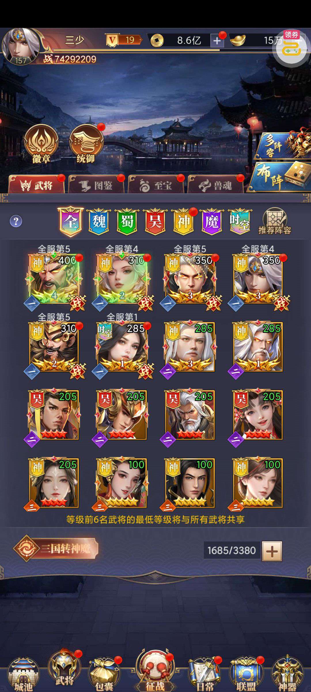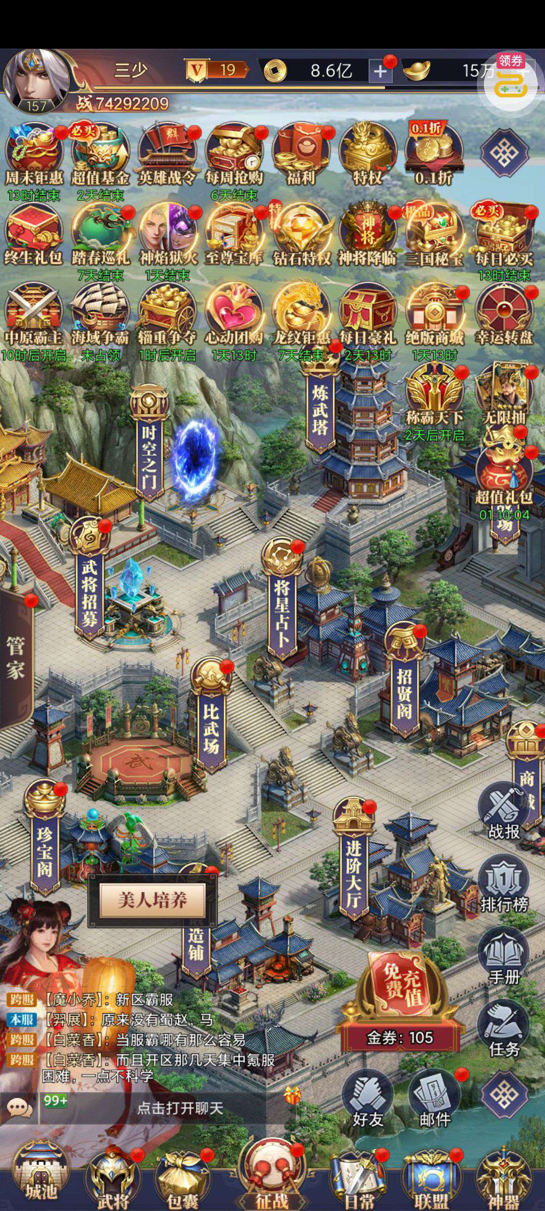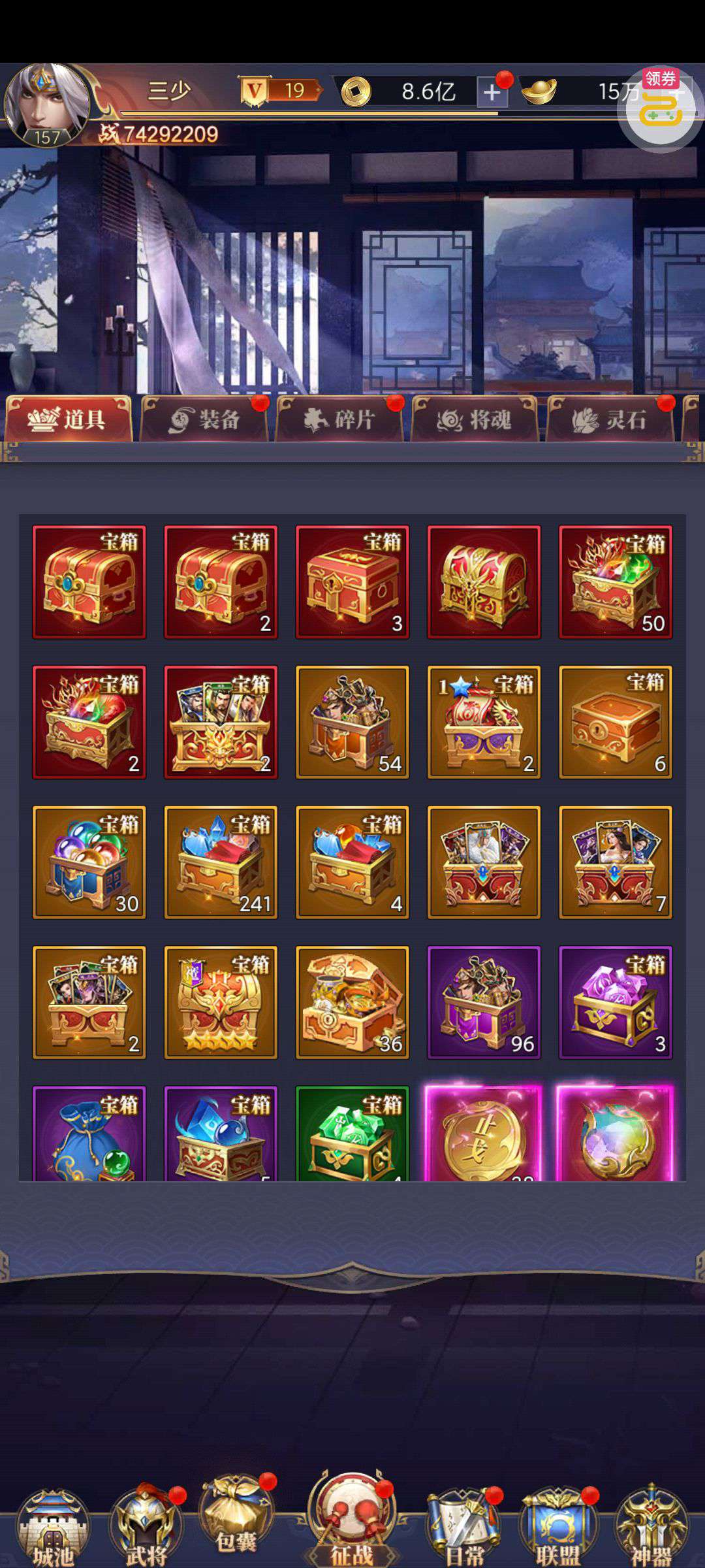 夺宝券*1、比武令*1、5星随机将魂*10(每个账号限领一次)