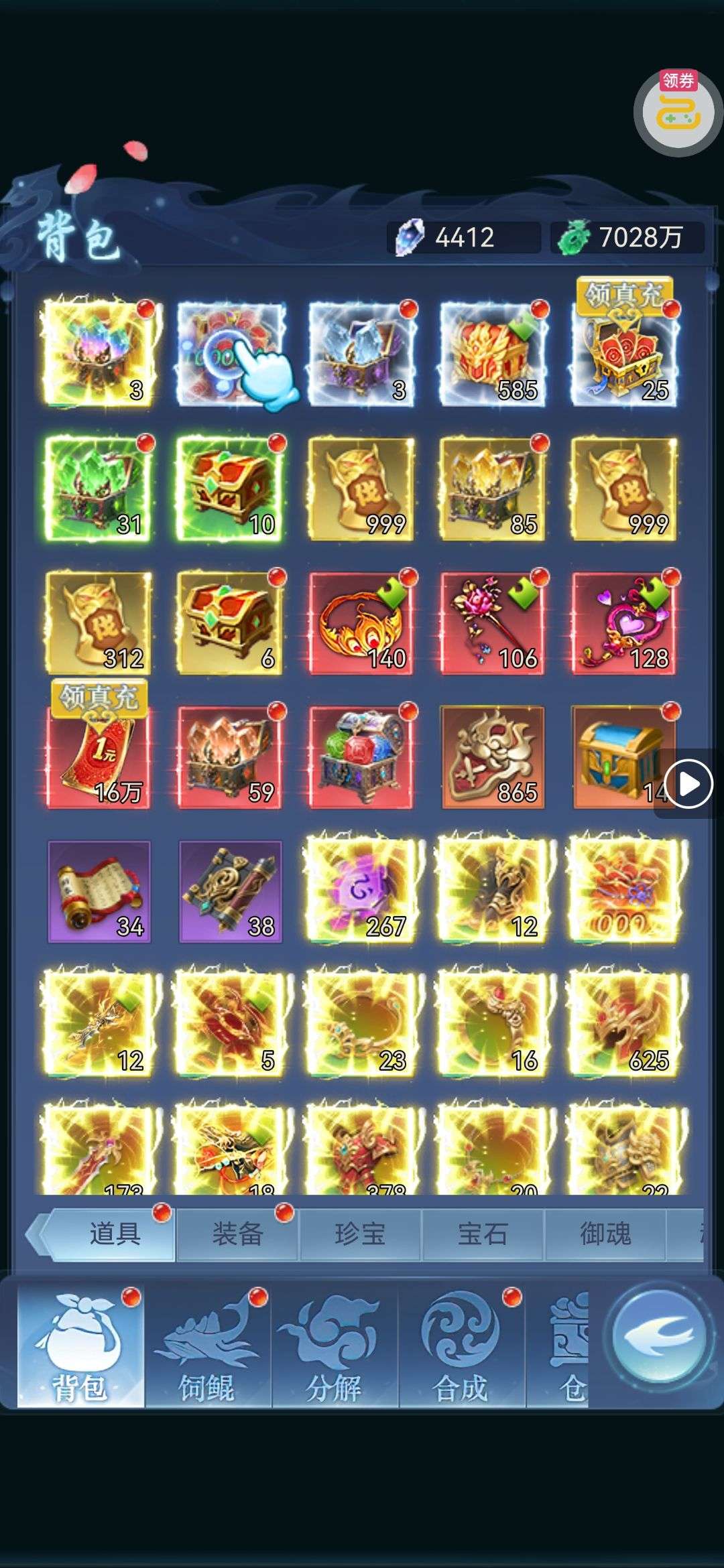 夺宝券*1、比武令*1、5星随机将魂*10(每个账号限领一次)