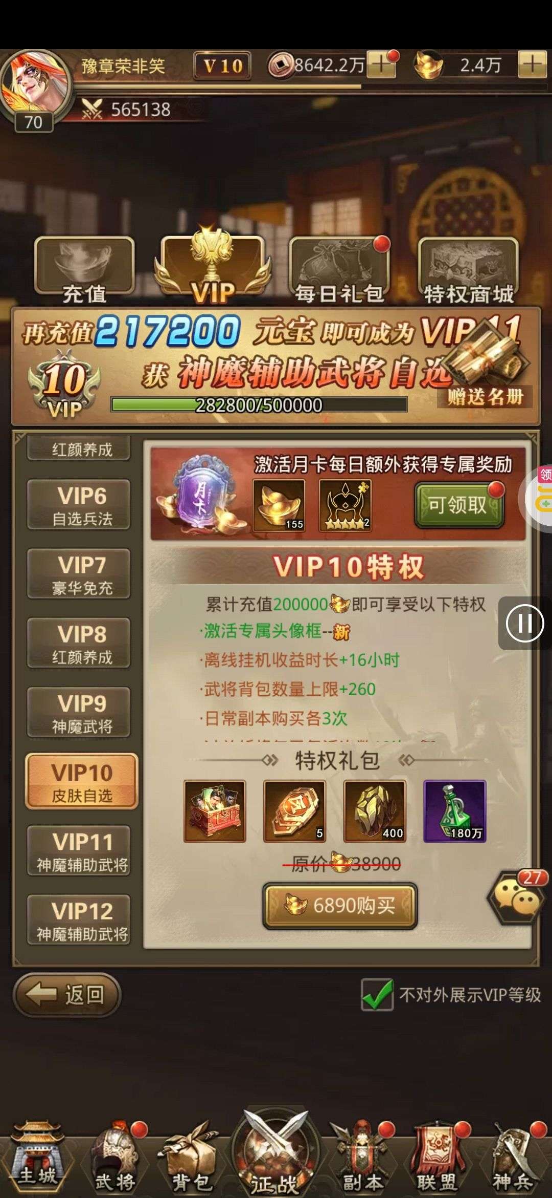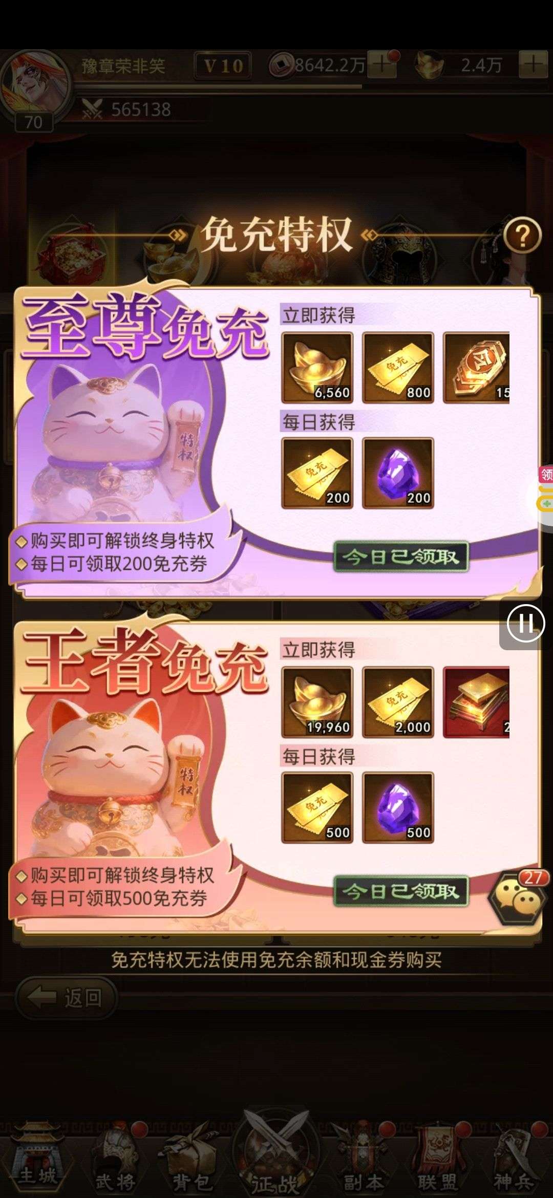 30张648真充卡豪礼、侠客灵丹*10、侠客神丹*10、侠客金丹*1、专属挑战令*1(每个账号限领一次)