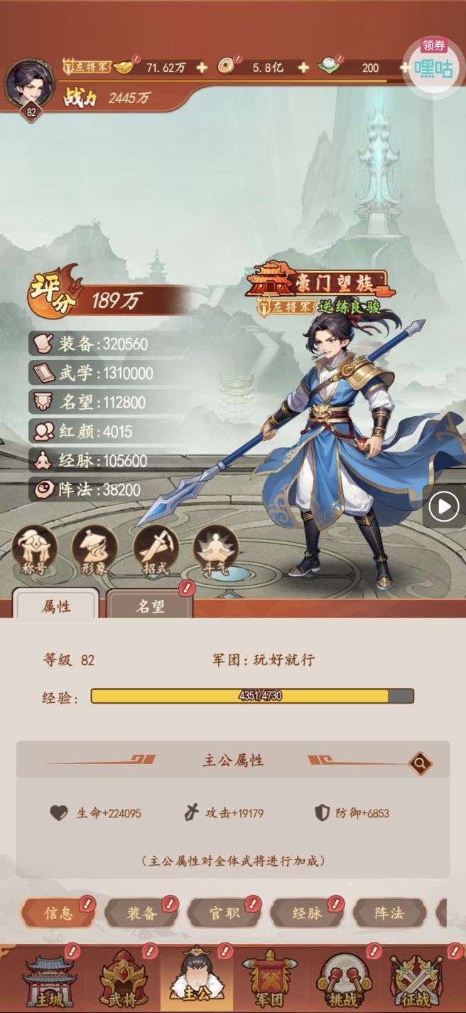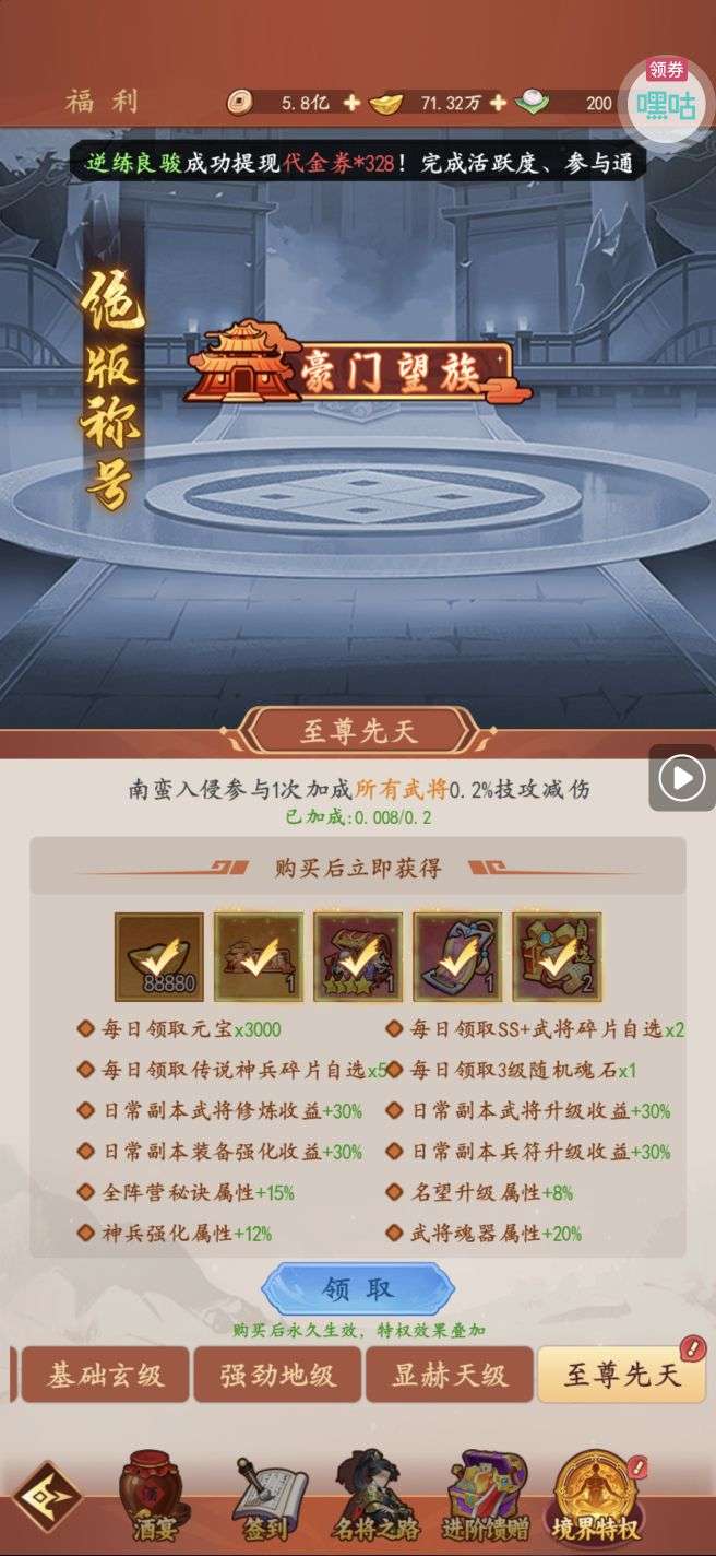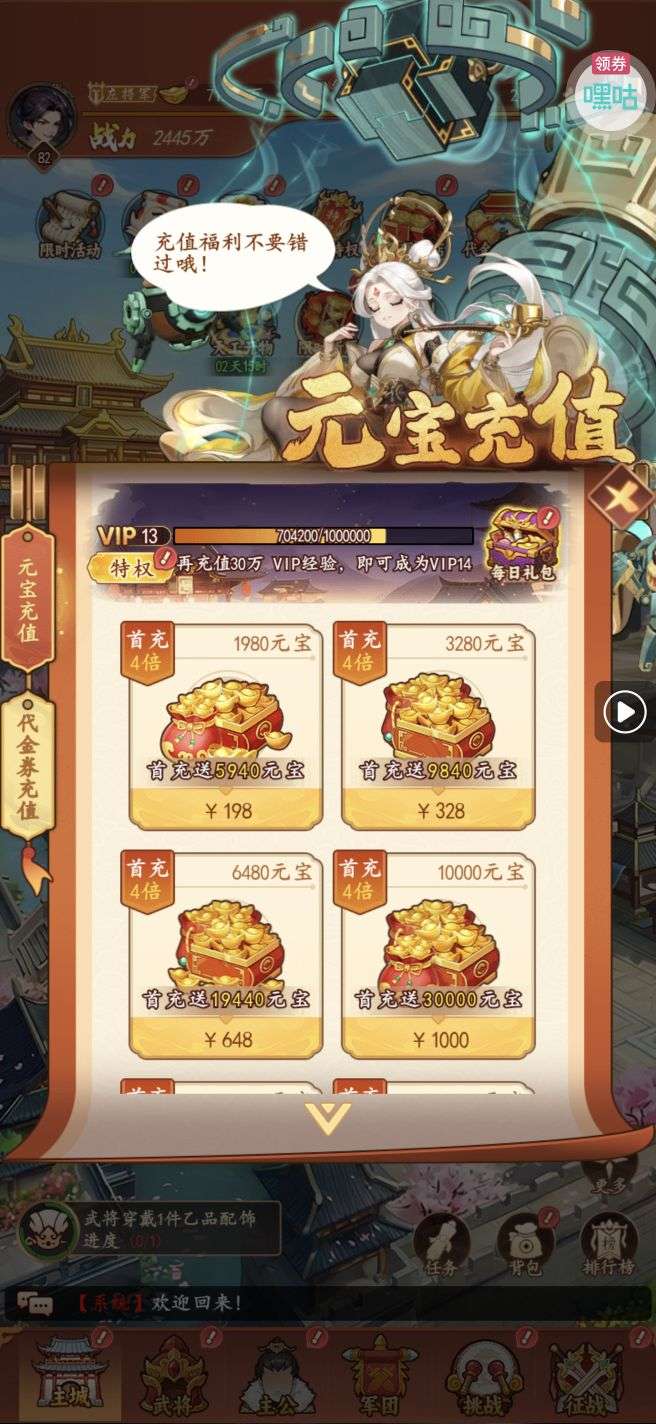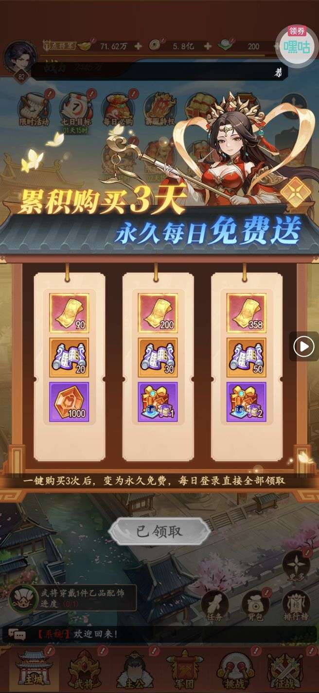 夺宝券*1、比武令*1、5星随机将魂*10(每个账号限领一次)
