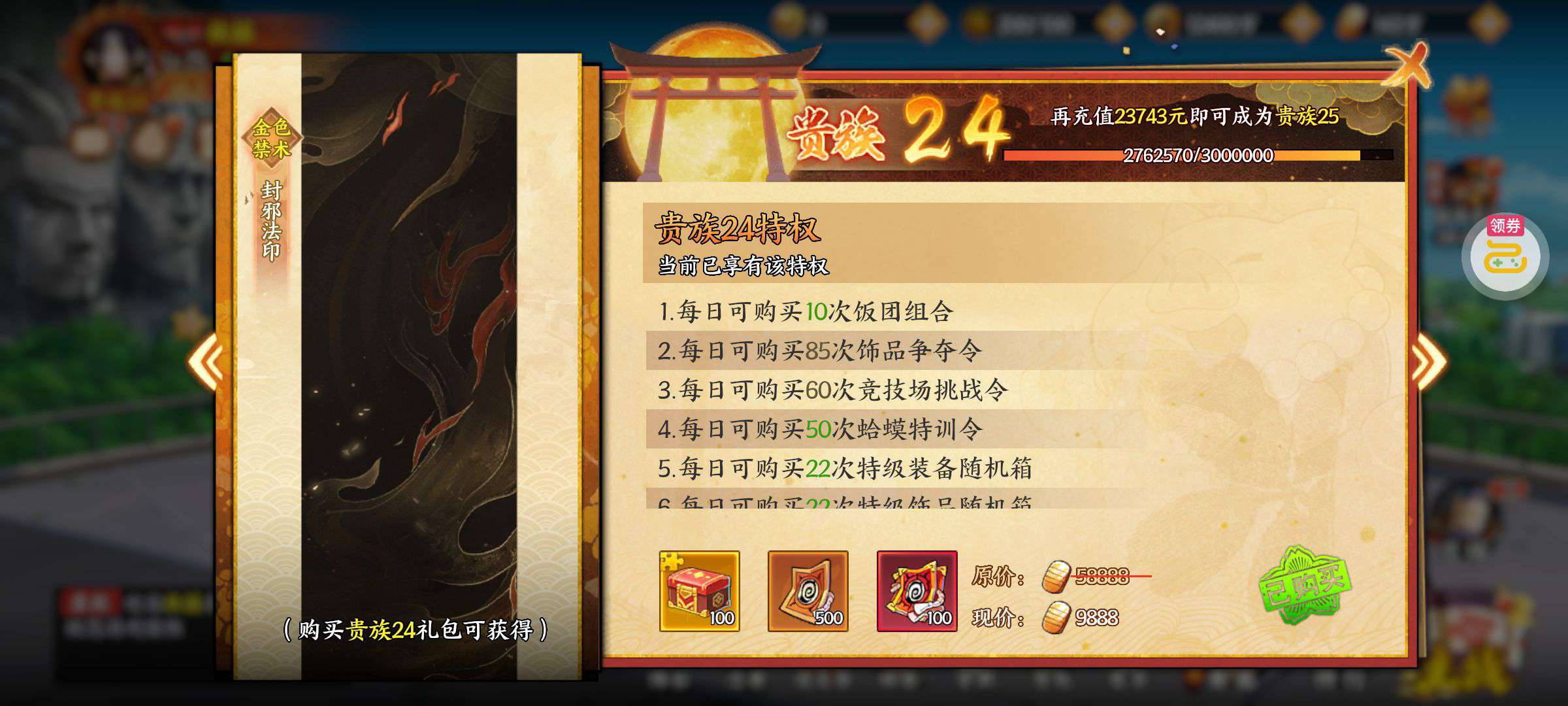 五阵营输出自选包*1、豪华材料自选礼包*2、高级忍法帖*20(每个账号限领一次)