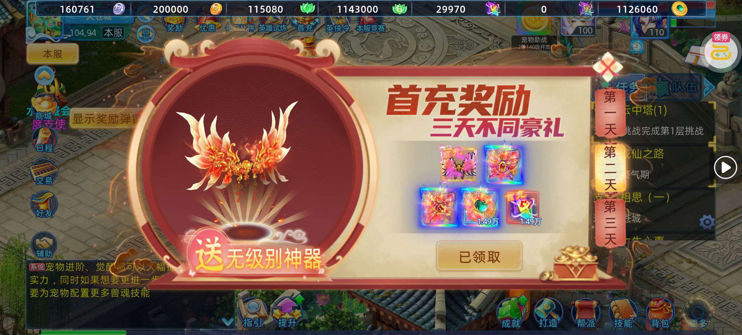 30张648真充卡豪礼、侠客灵丹*10、侠客神丹*10、侠客金丹*1、专属挑战令*1(每个账号限领一次)