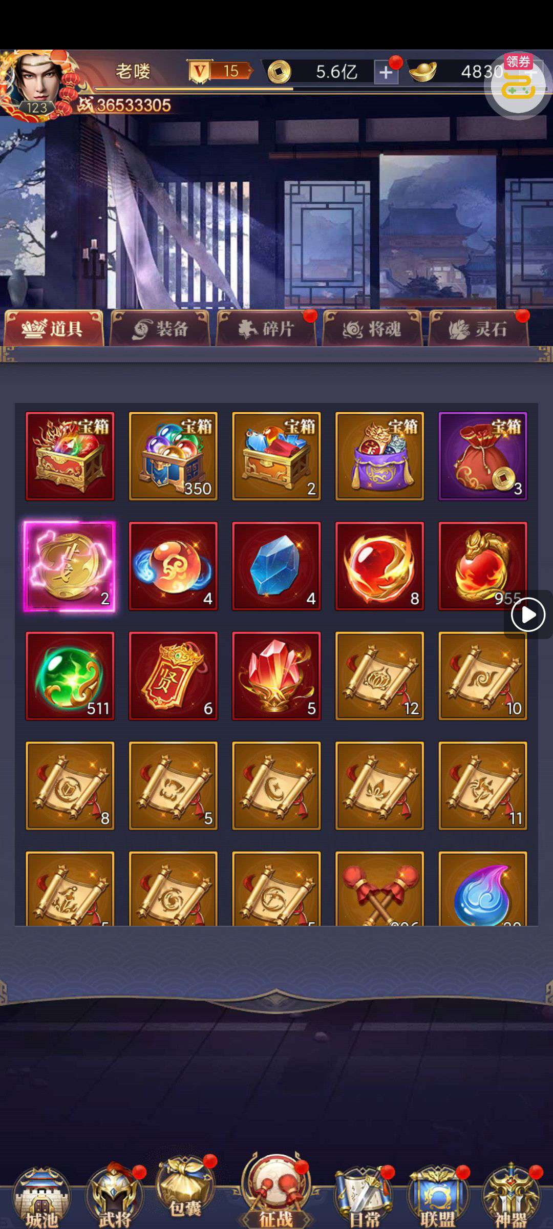 夺宝券*1、比武令*1、5星随机将魂*10(每个账号限领一次)