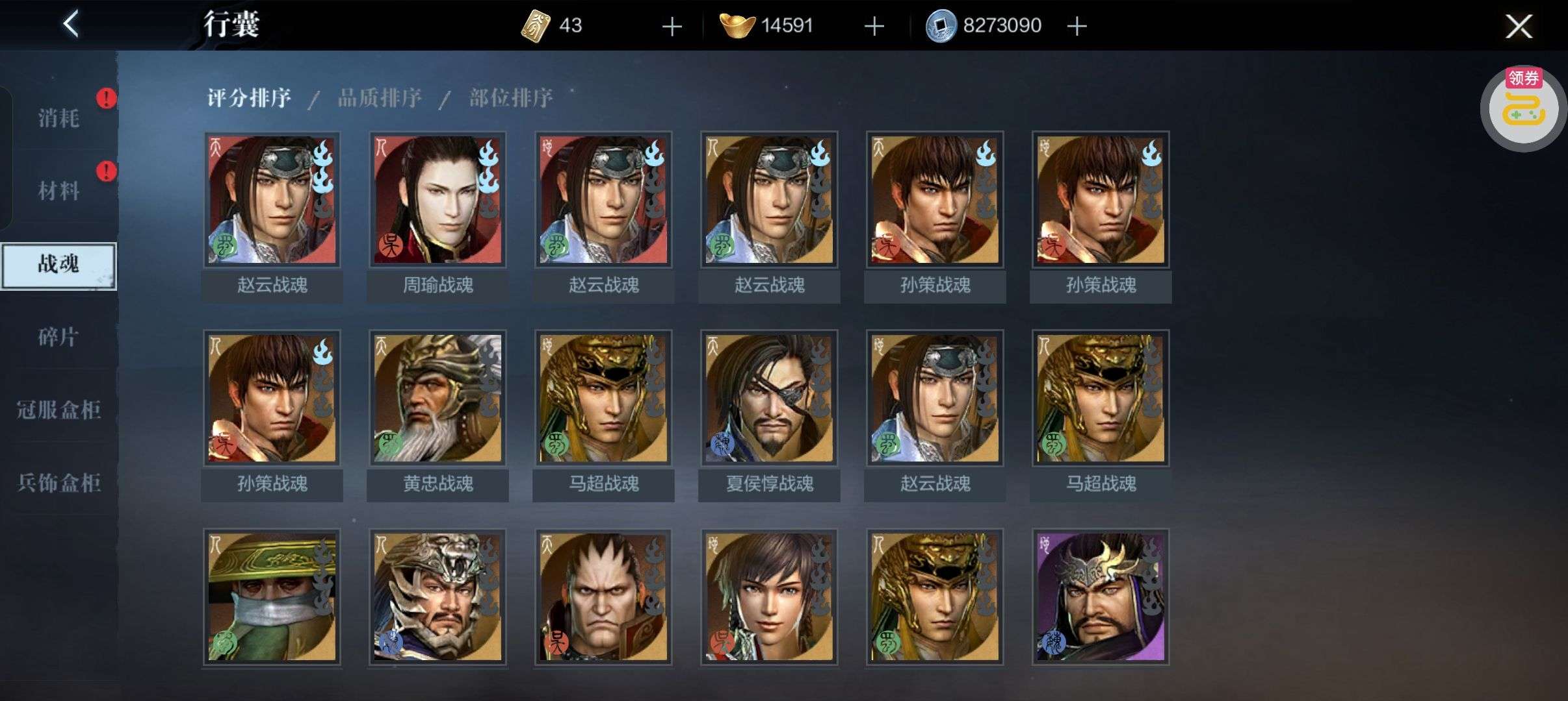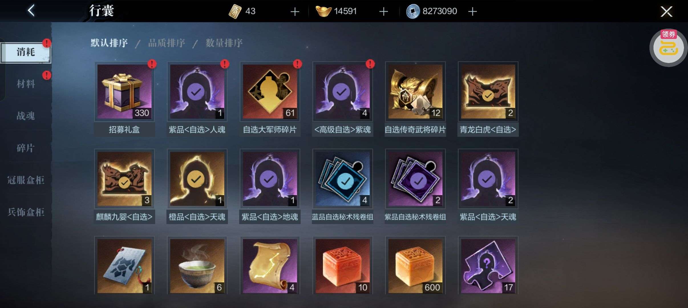 夺宝券*1、比武令*1、5星随机将魂*10(每个账号限领一次)