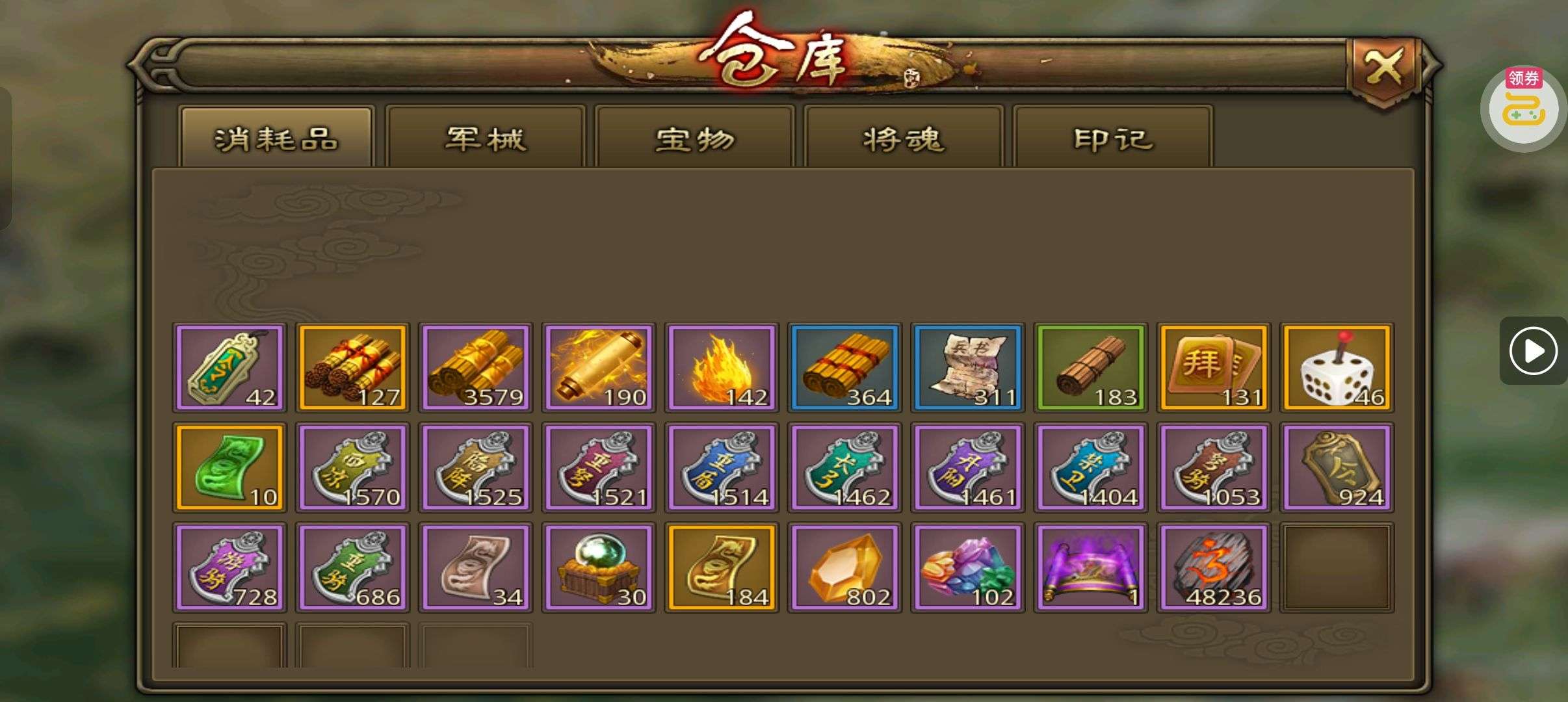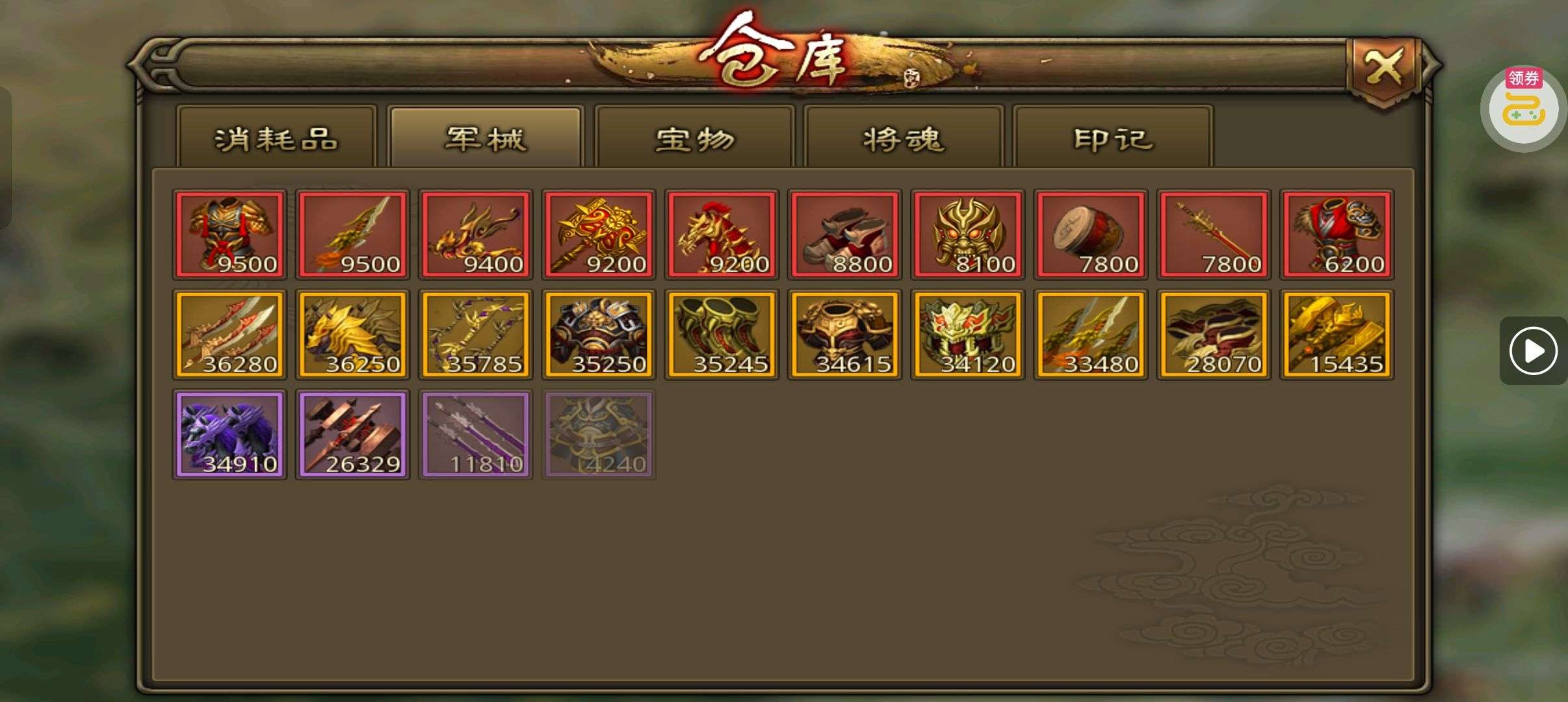 夺宝券*1、比武令*1、5星随机将魂*10(每个账号限领一次)
