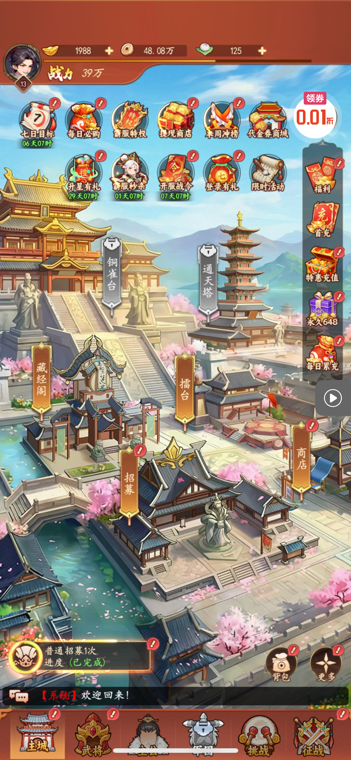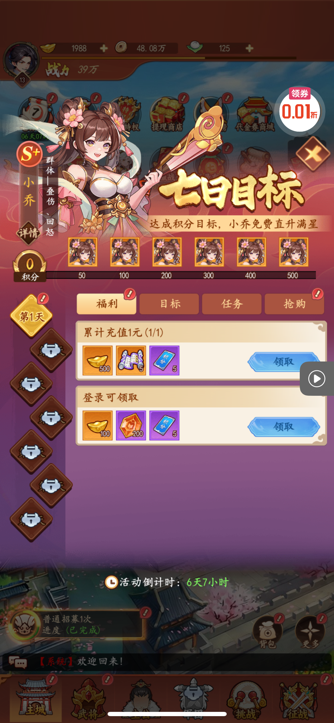 夺宝券*1、比武令*1、5星随机将魂*10(每个账号限领一次)