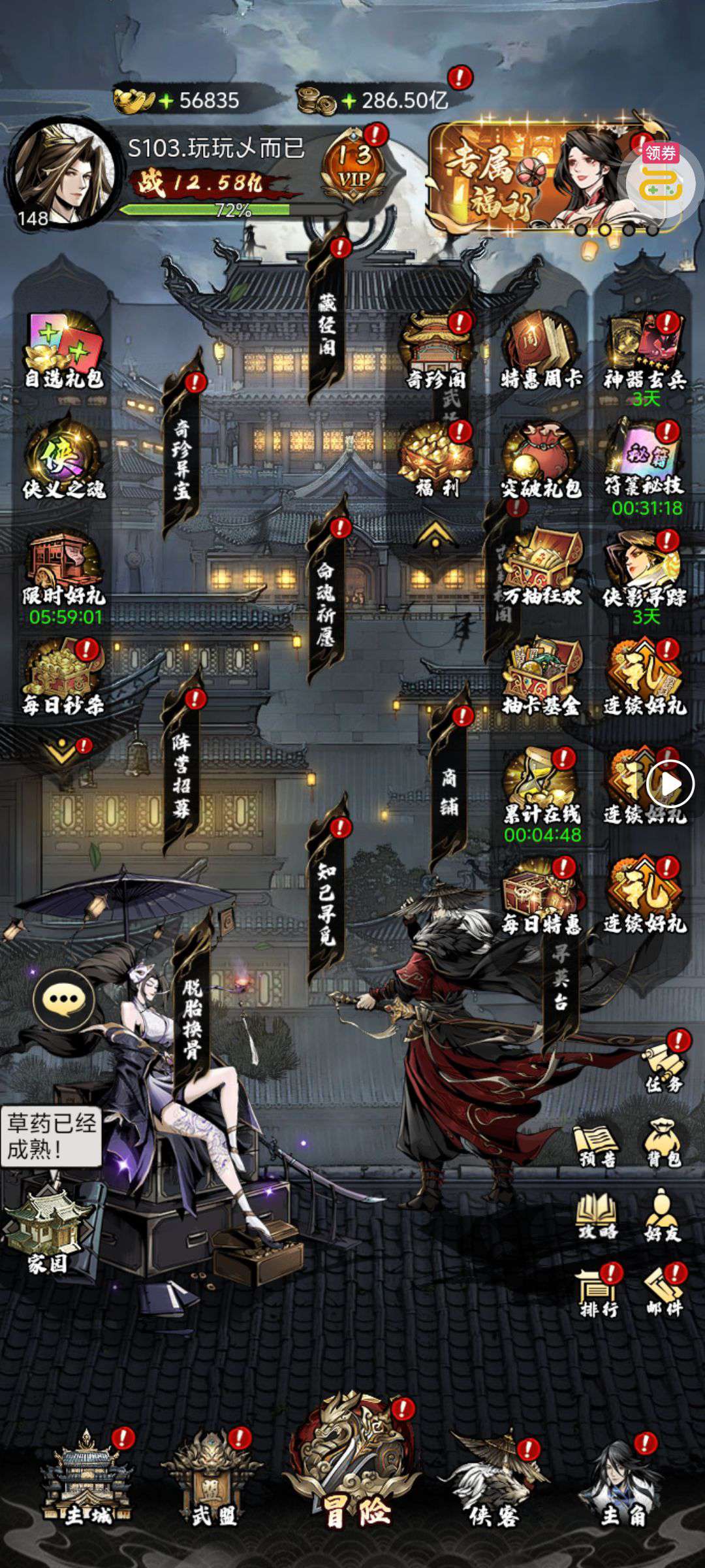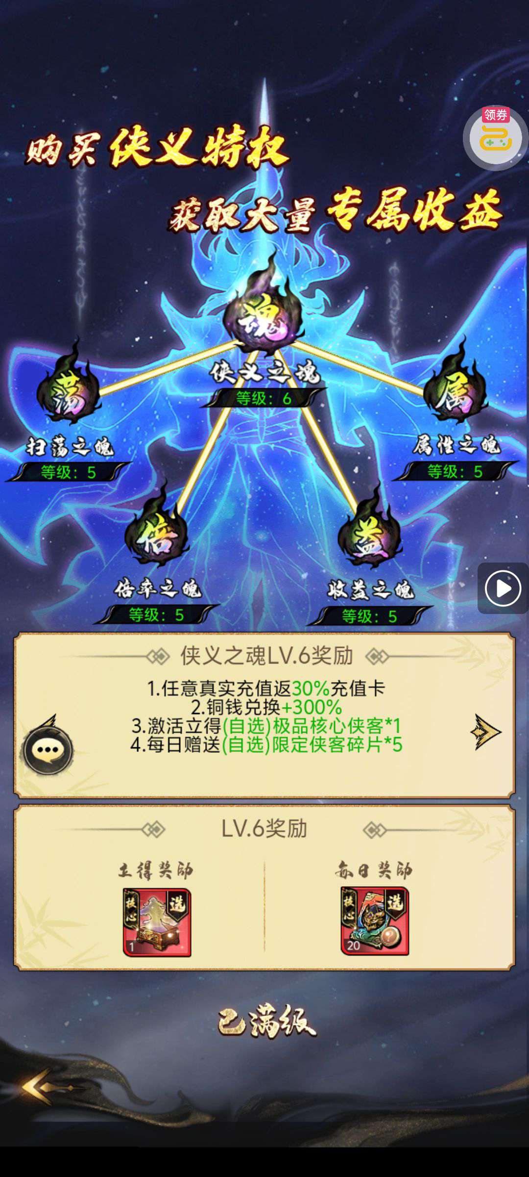 30张648真充卡豪礼、侠客灵丹*10、侠客神丹*10、侠客金丹*1、专属挑战令*1(每个账号限领一次)