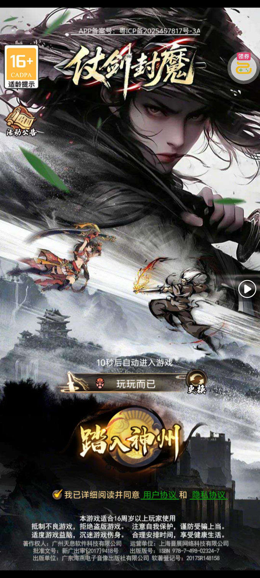 夺宝券*1、比武令*1、5星随机将魂*10(每个账号限领一次)