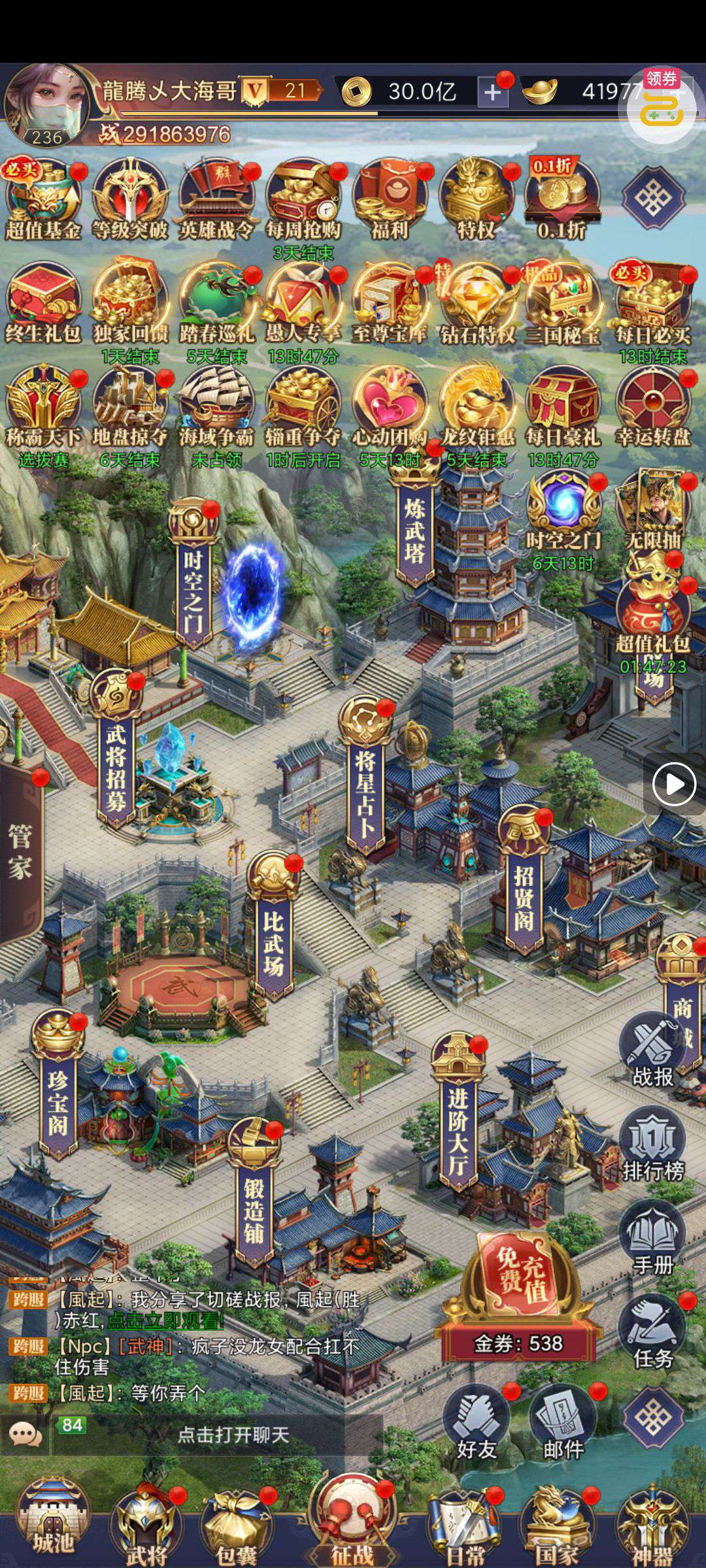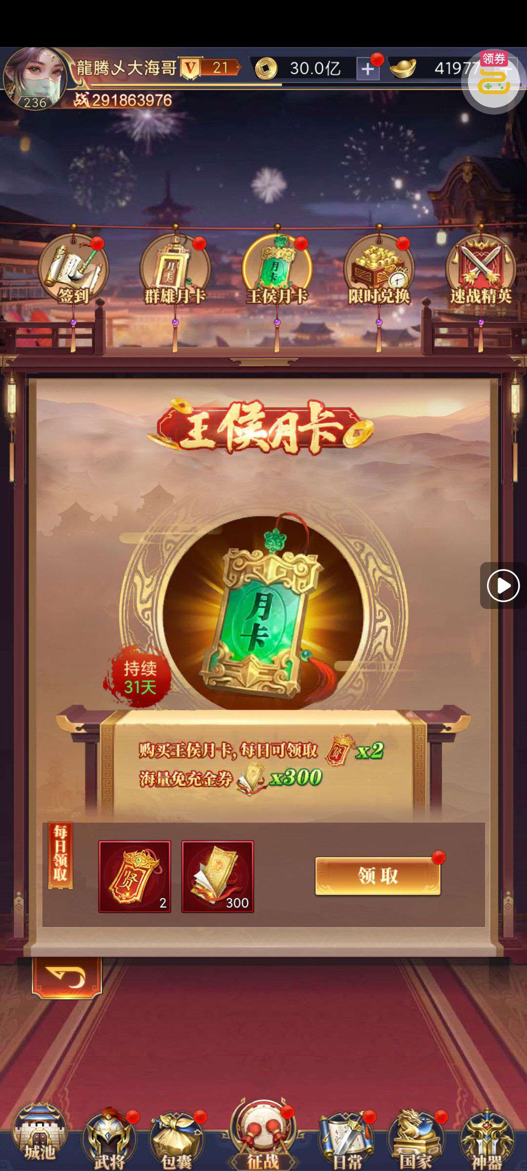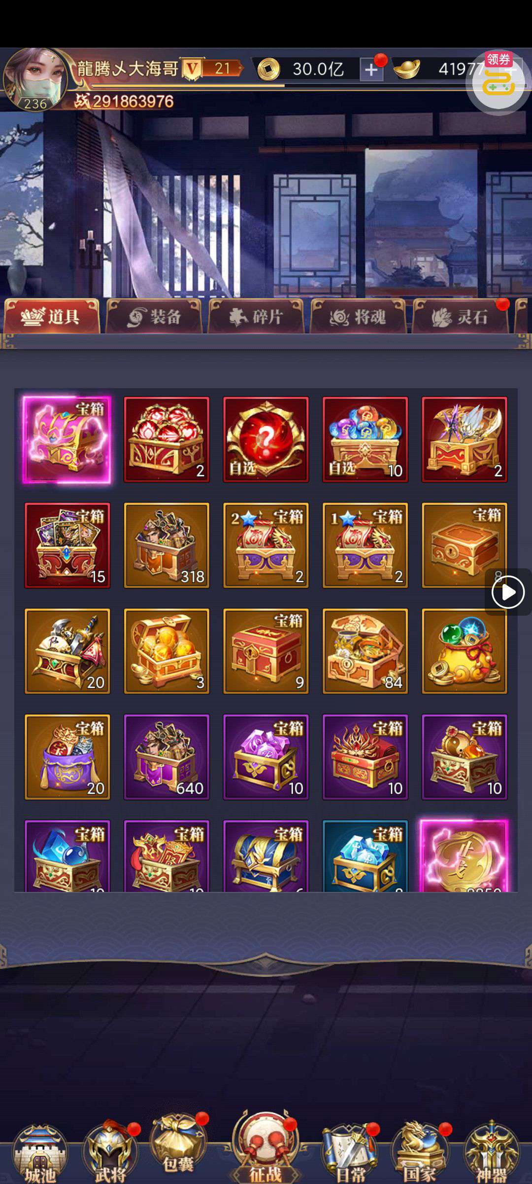 夺宝券*1、比武令*1、5星随机将魂*10(每个账号限领一次)
