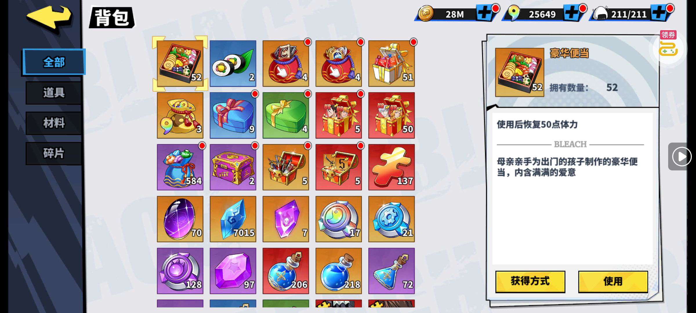 五阵营输出自选包*1、豪华材料自选礼包*2、高级忍法帖*20(每个账号限领一次)