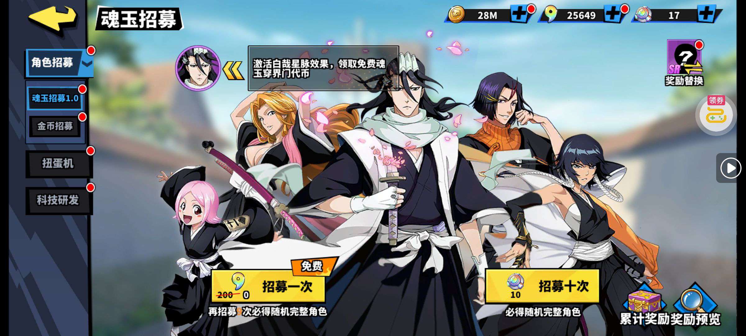 夺宝券*1、比武令*1、5星随机将魂*10(每个账号限领一次)