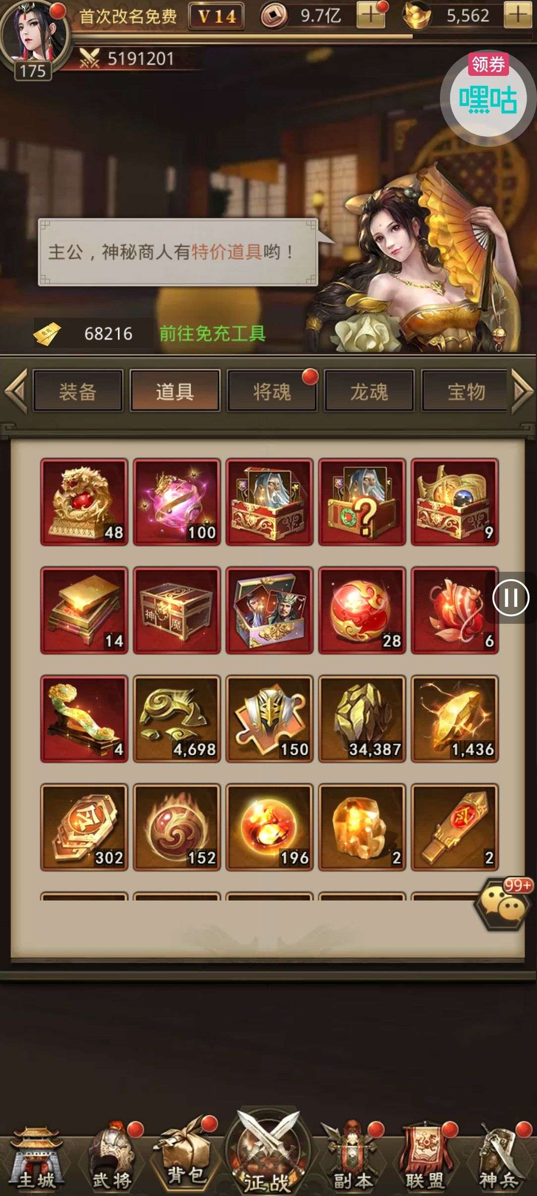 夺宝券*1、比武令*1、5星随机将魂*10(每个账号限领一次)