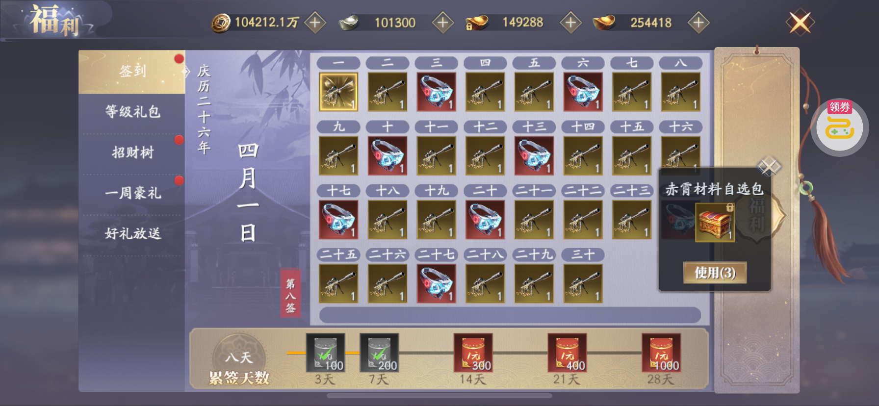 夺宝券*1、比武令*1、5星随机将魂*10(每个账号限领一次)