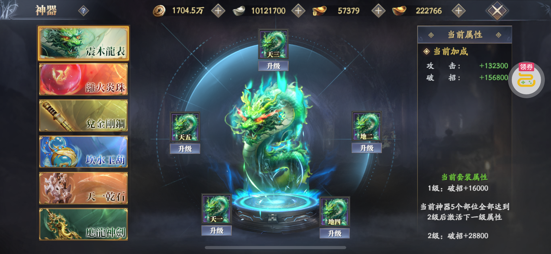 夺宝券*1、比武令*1、5星随机将魂*10(每个账号限领一次)