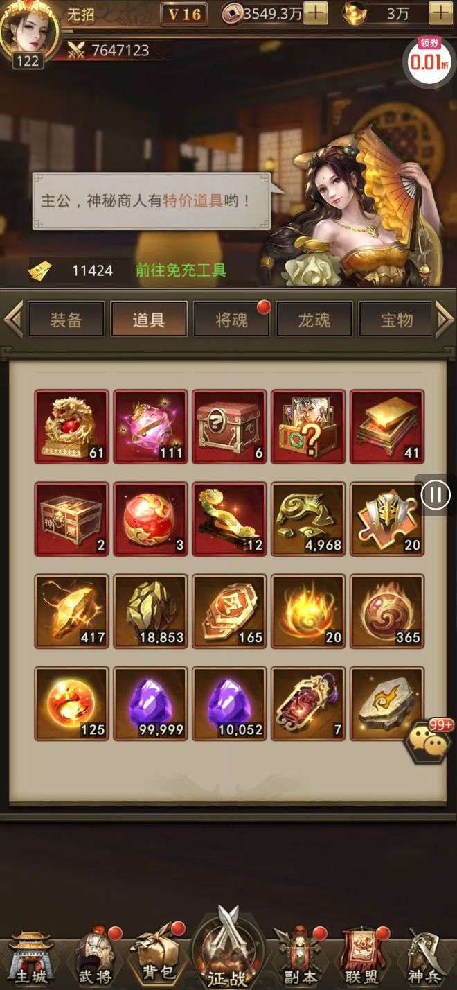 夺宝券*1、比武令*1、5星随机将魂*10(每个账号限领一次)