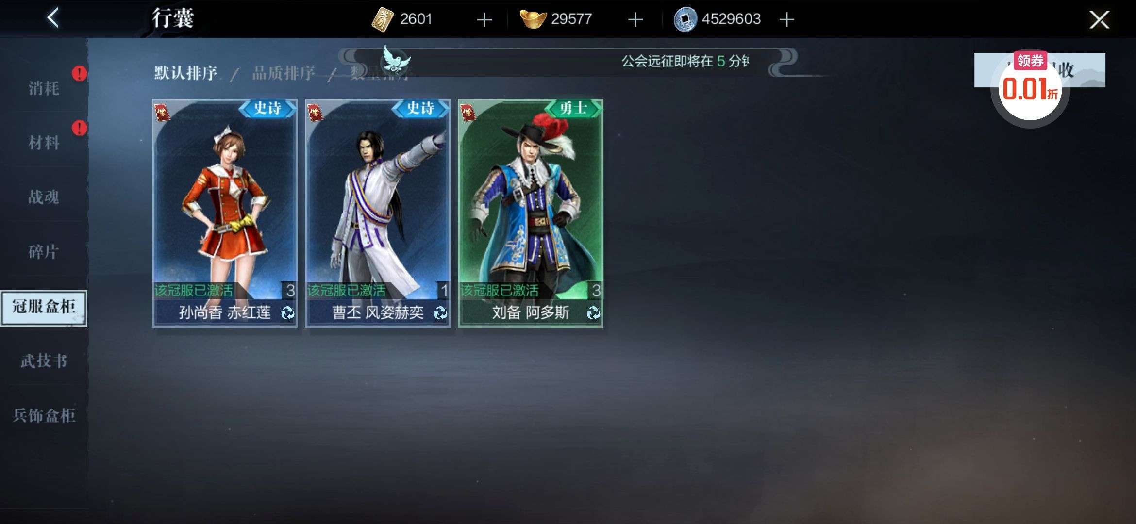 夺宝券*1、比武令*1、5星随机将魂*10(每个账号限领一次)