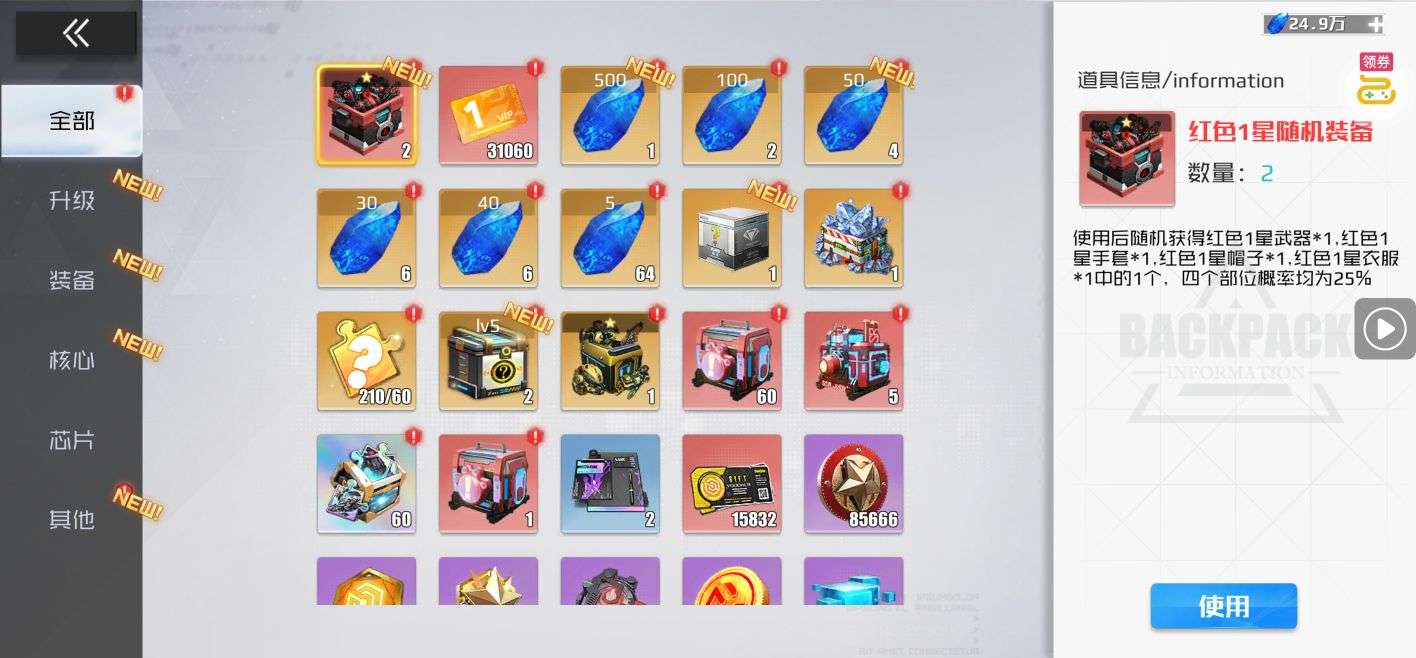 芯片熔炼石*1、离子探针*50、净化金属*50(每个账号限领一次)
