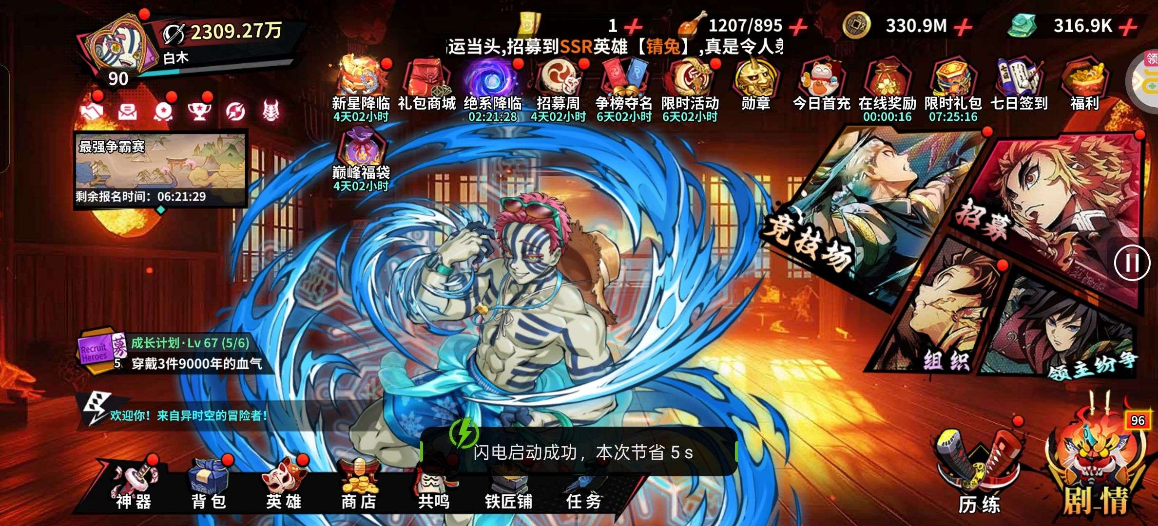 夺宝券*1、比武令*1、5星随机将魂*10(每个账号限领一次)
