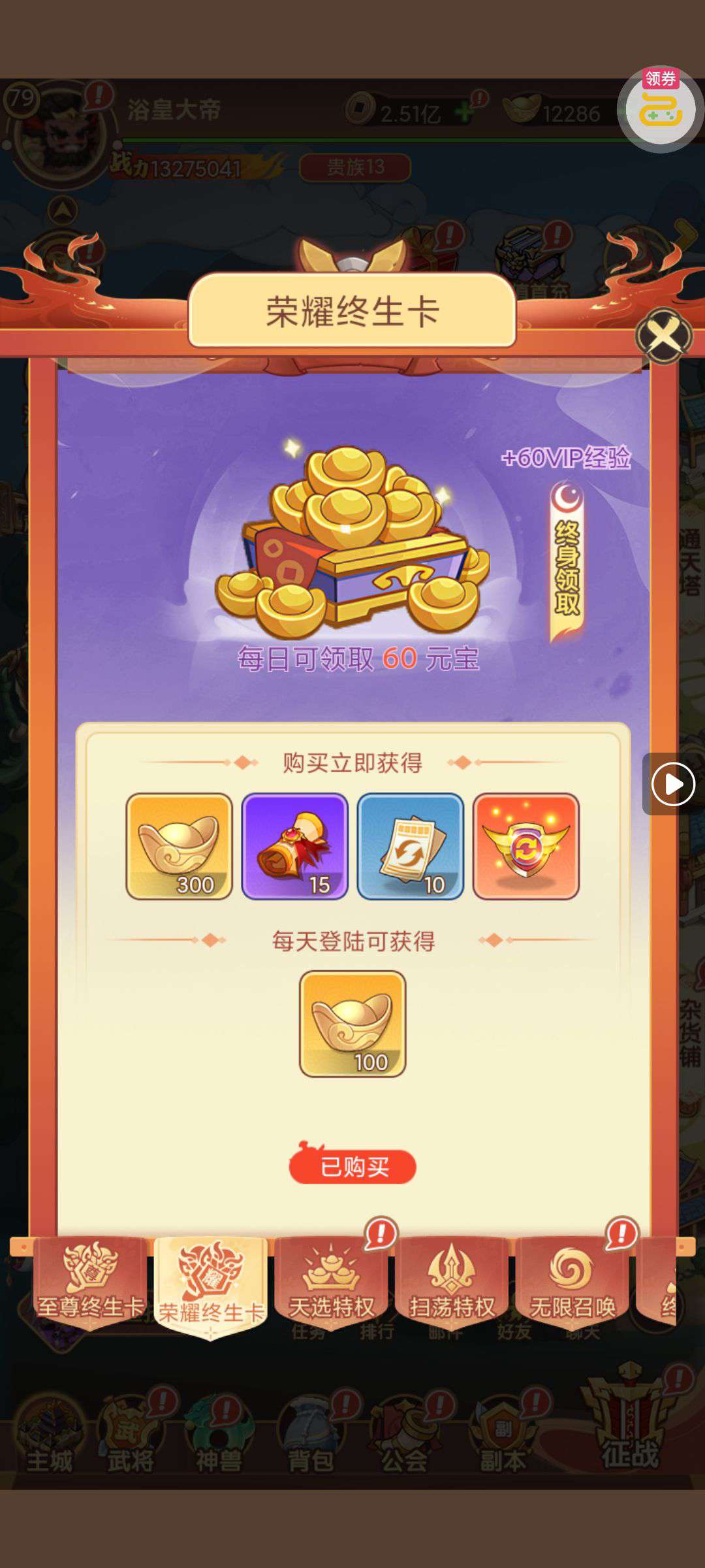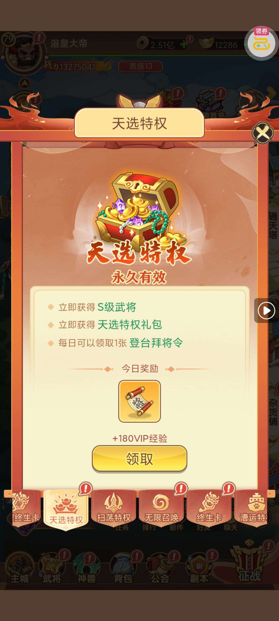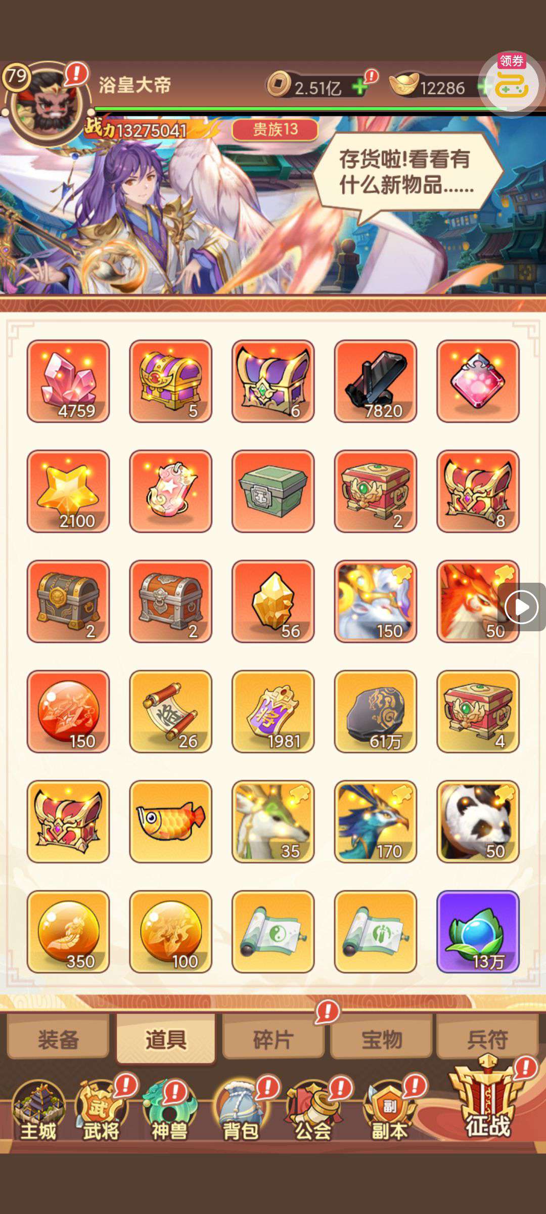 夺宝券*1、比武令*1、5星随机将魂*10(每个账号限领一次)