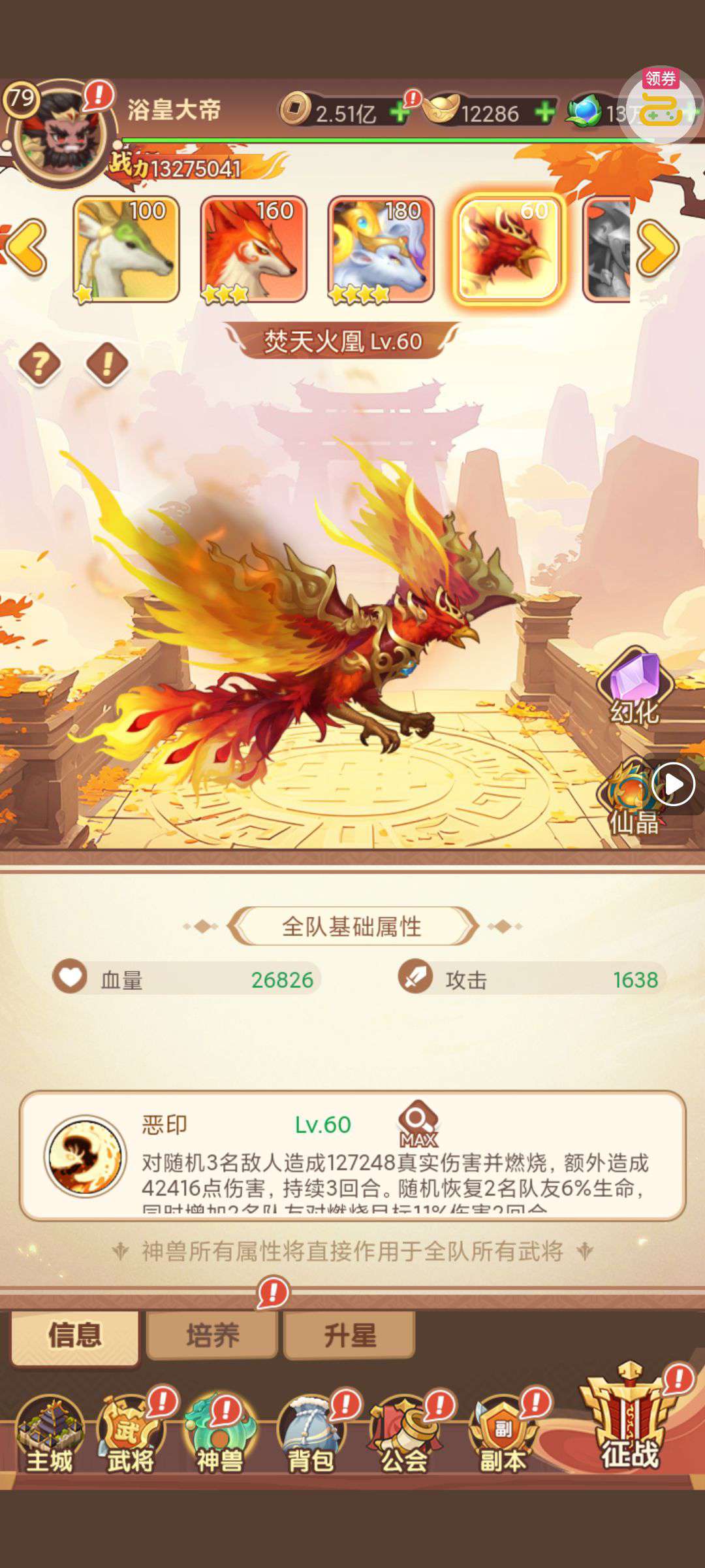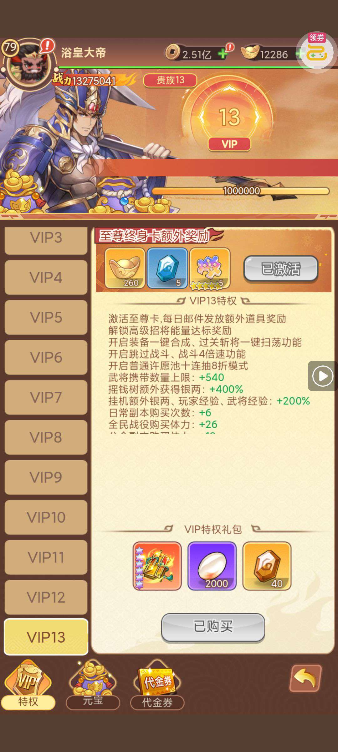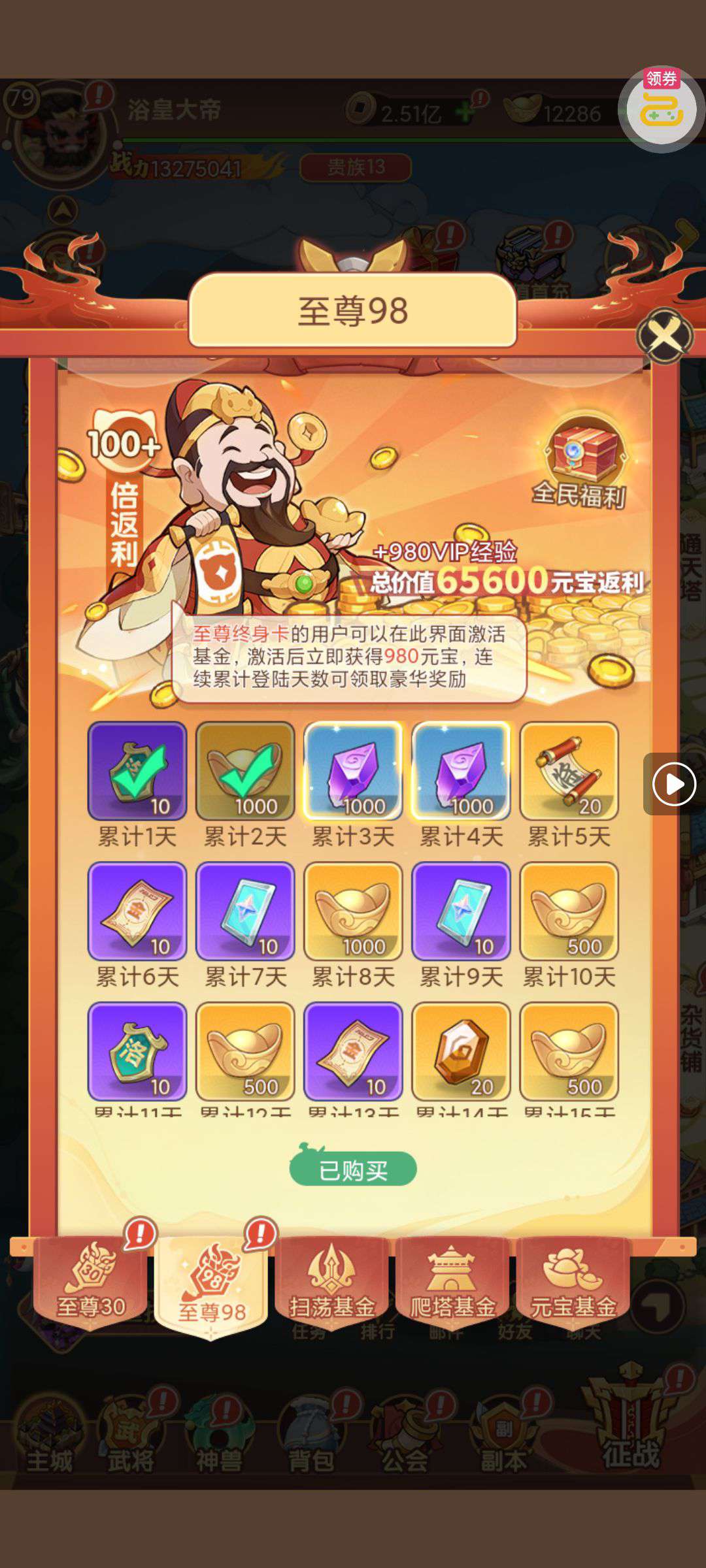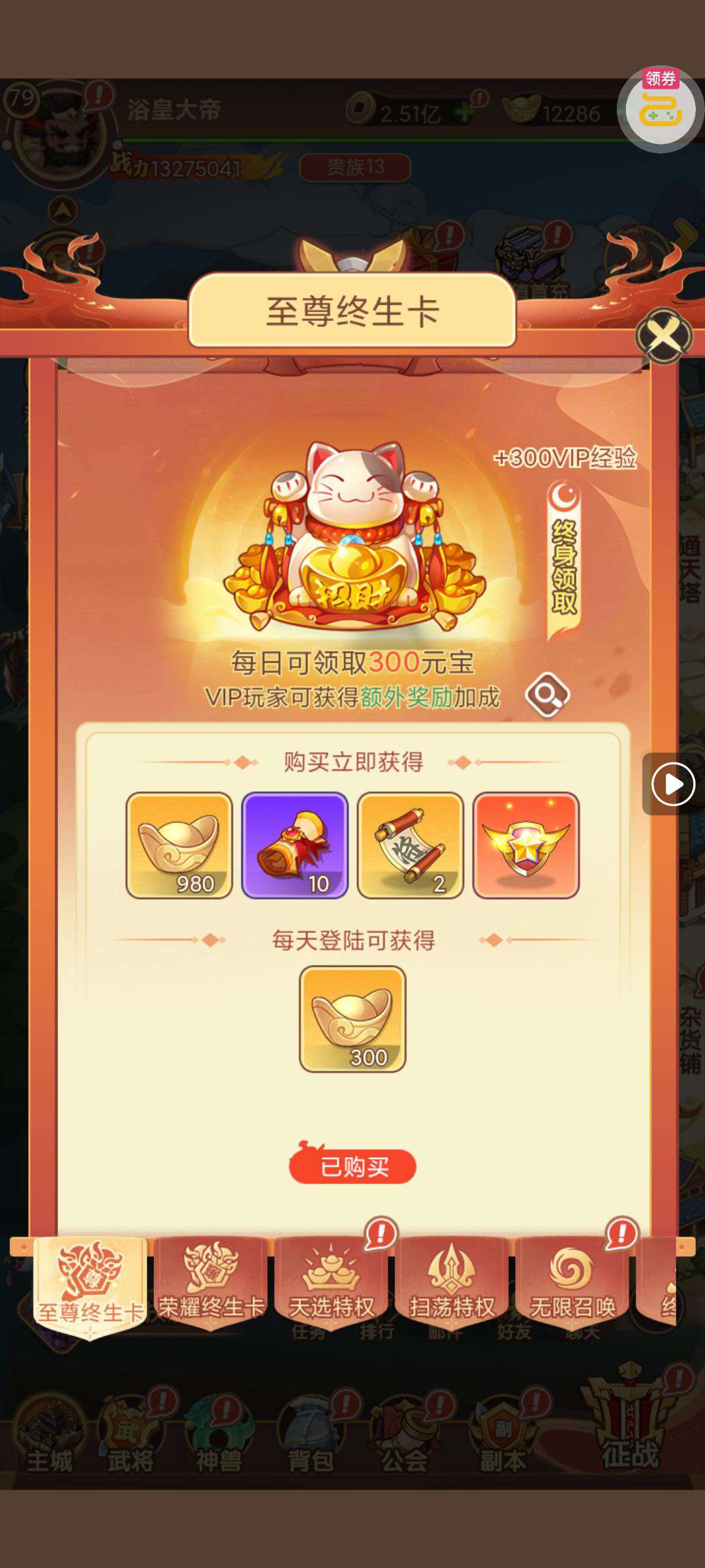 夺宝券*1、比武令*1、5星随机将魂*10(每个账号限领一次)