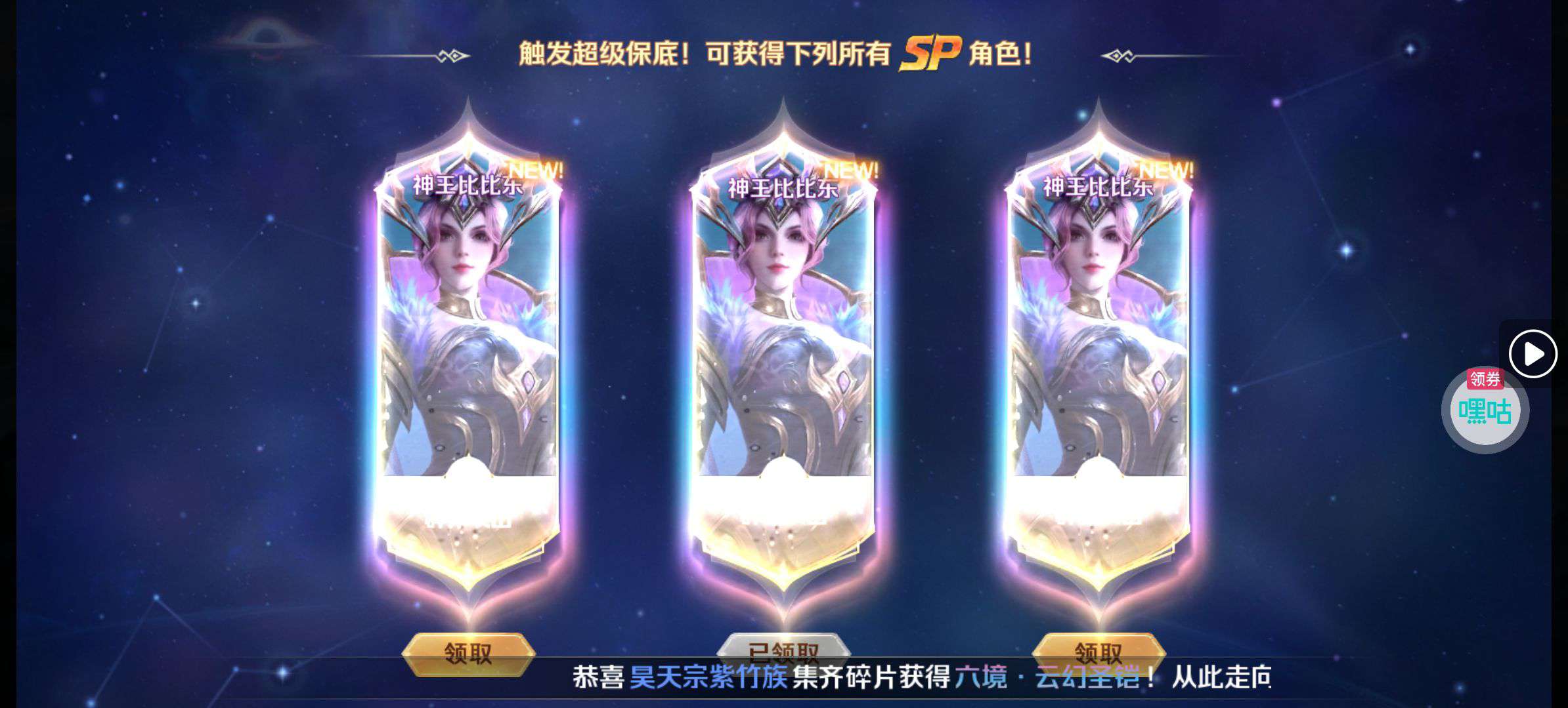 夺宝券*1、比武令*1、5星随机将魂*10(每个账号限领一次)