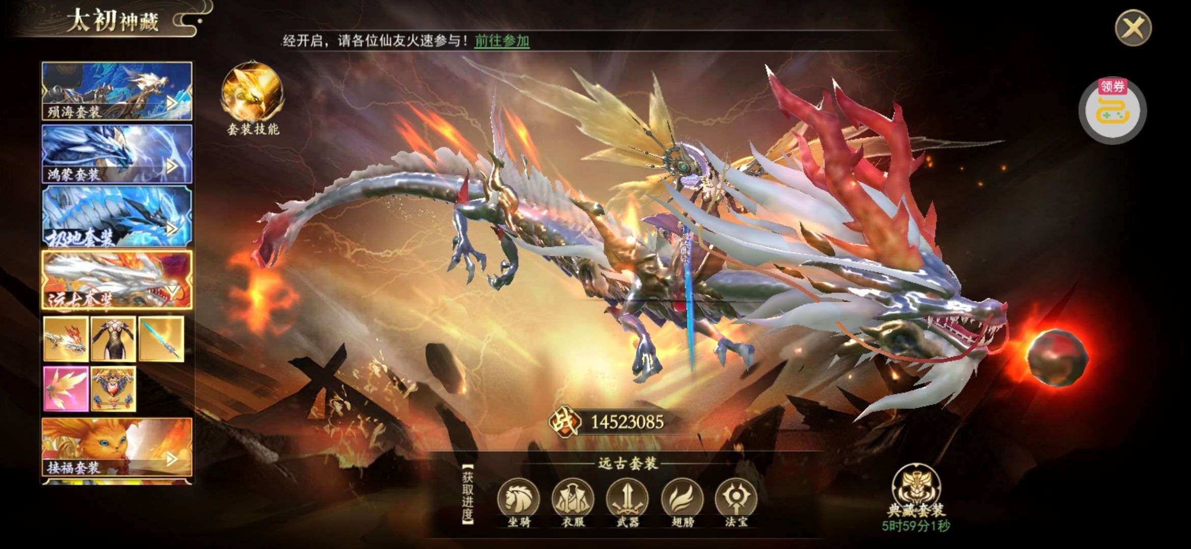 夺宝券*1、比武令*1、5星随机将魂*10(每个账号限领一次)