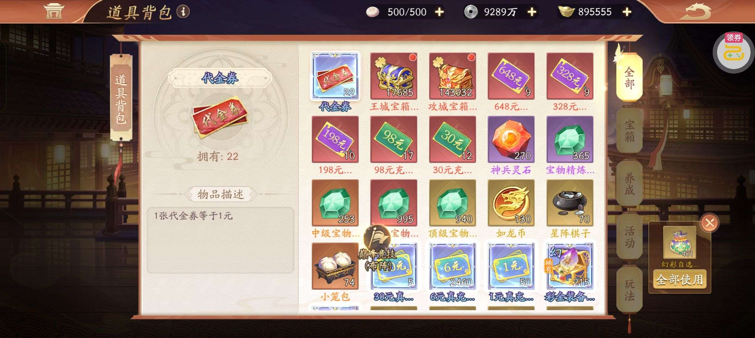 30张648真充卡豪礼、侠客灵丹*10、侠客神丹*10、侠客金丹*1、专属挑战令*1(每个账号限领一次)