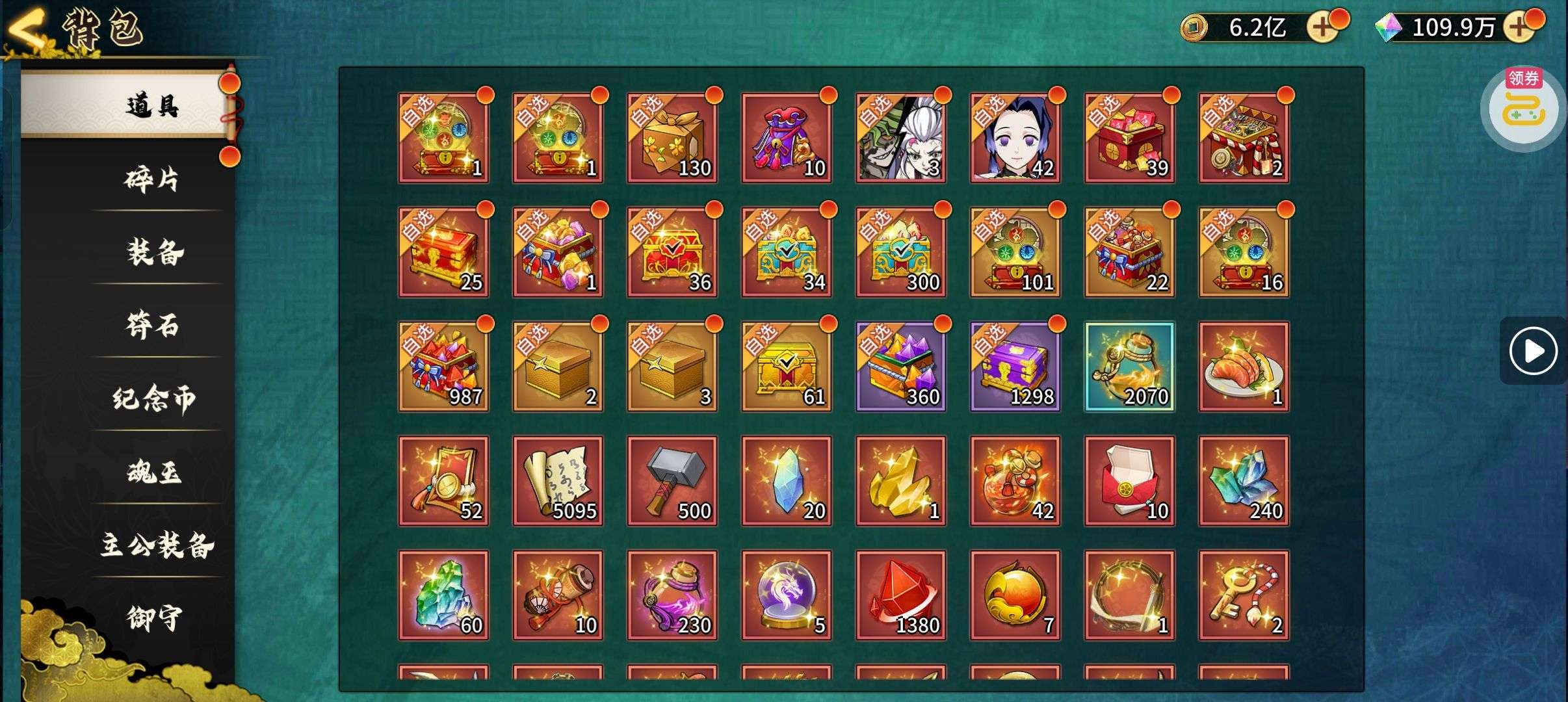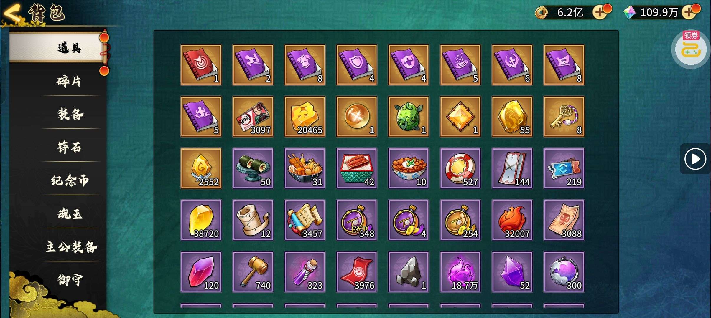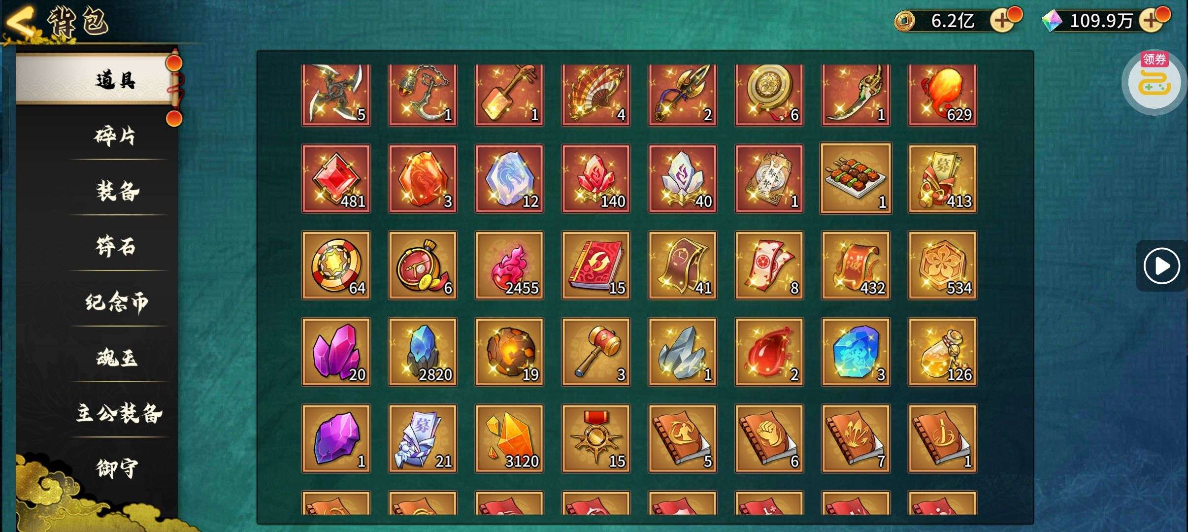 夺宝券*1、比武令*1、5星随机将魂*10(每个账号限领一次)