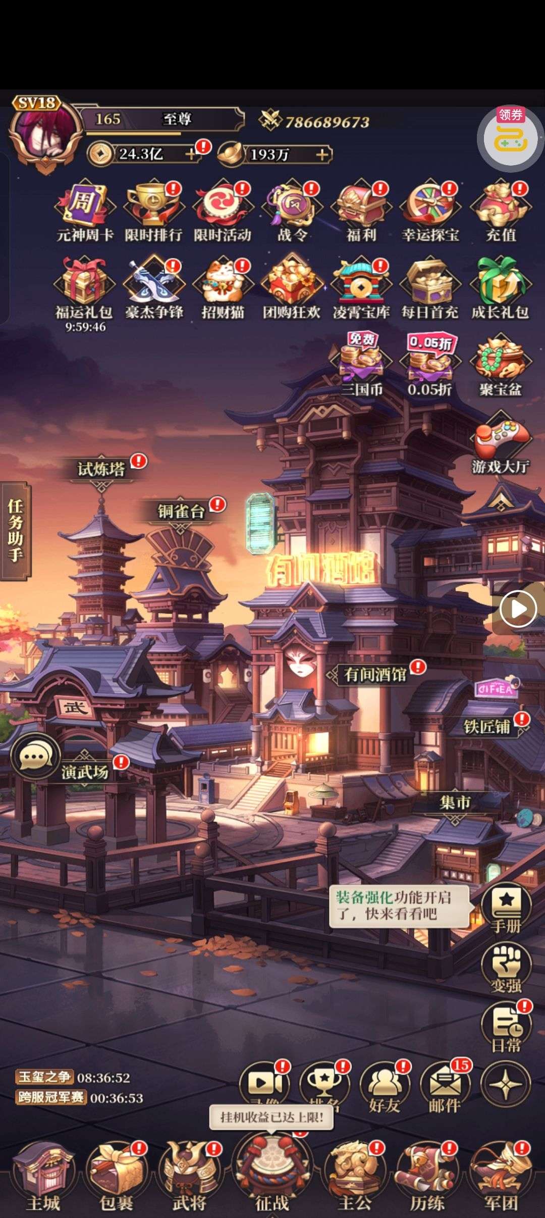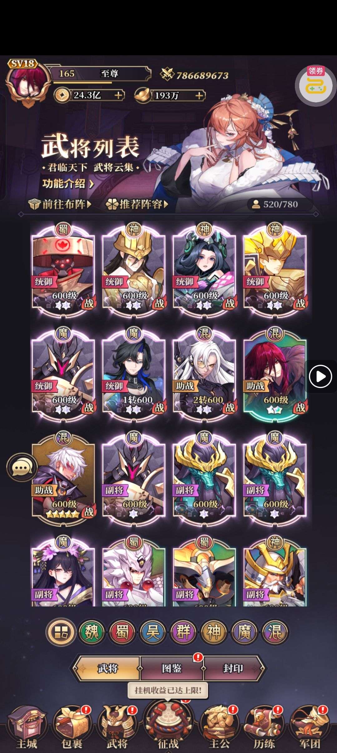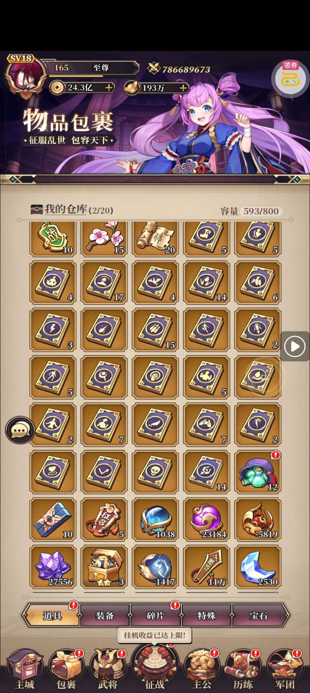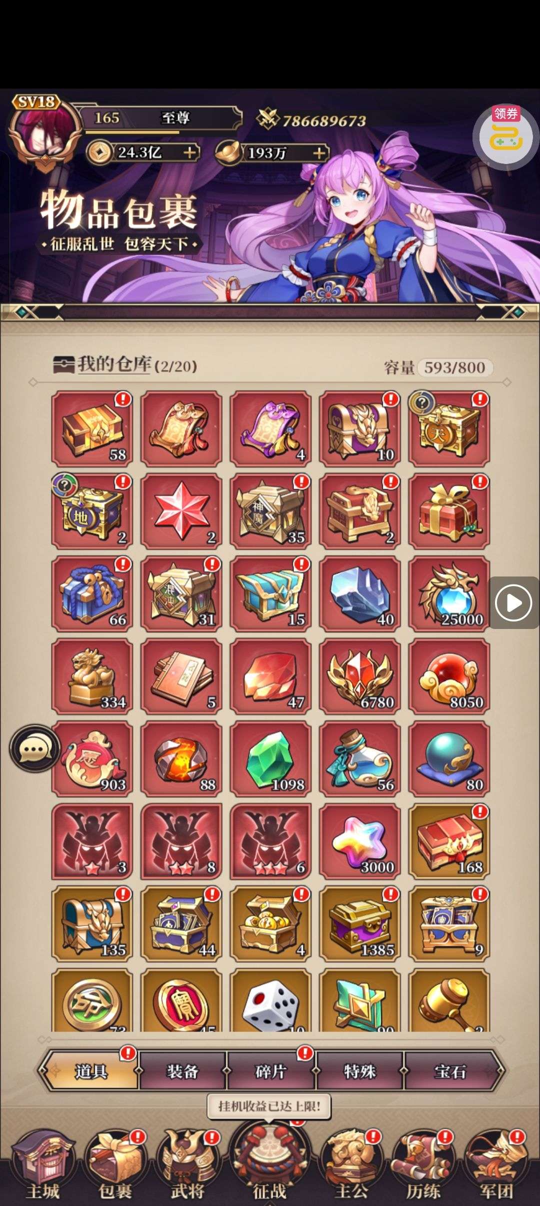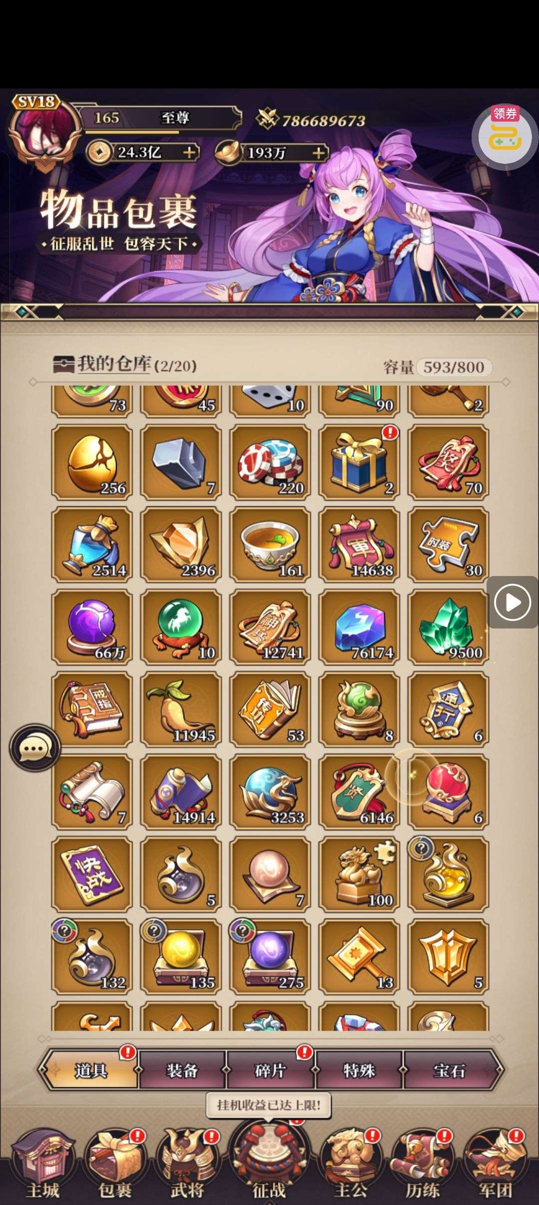 资源超多,盒子一大堆,可以培养8个17星,李白周瑜已满,还有7万三国币