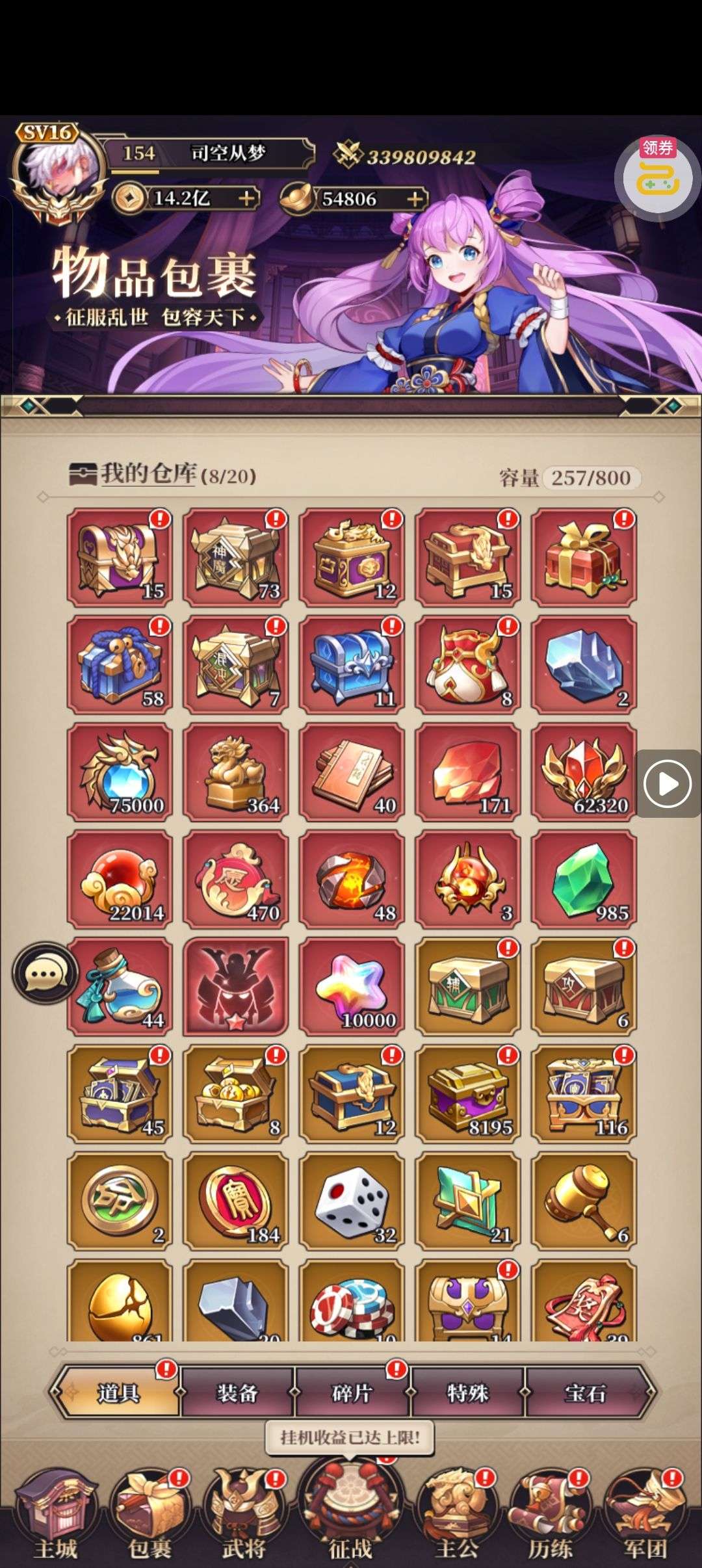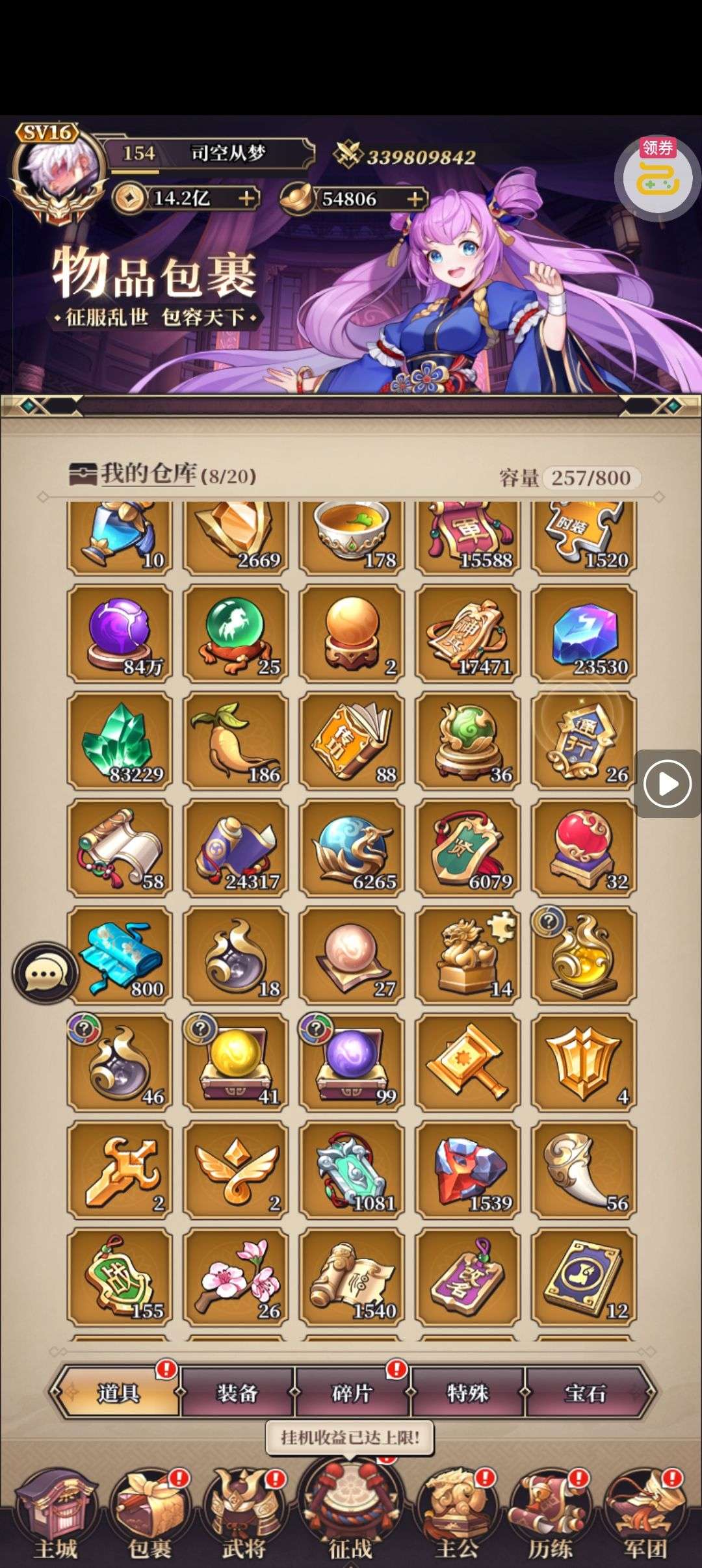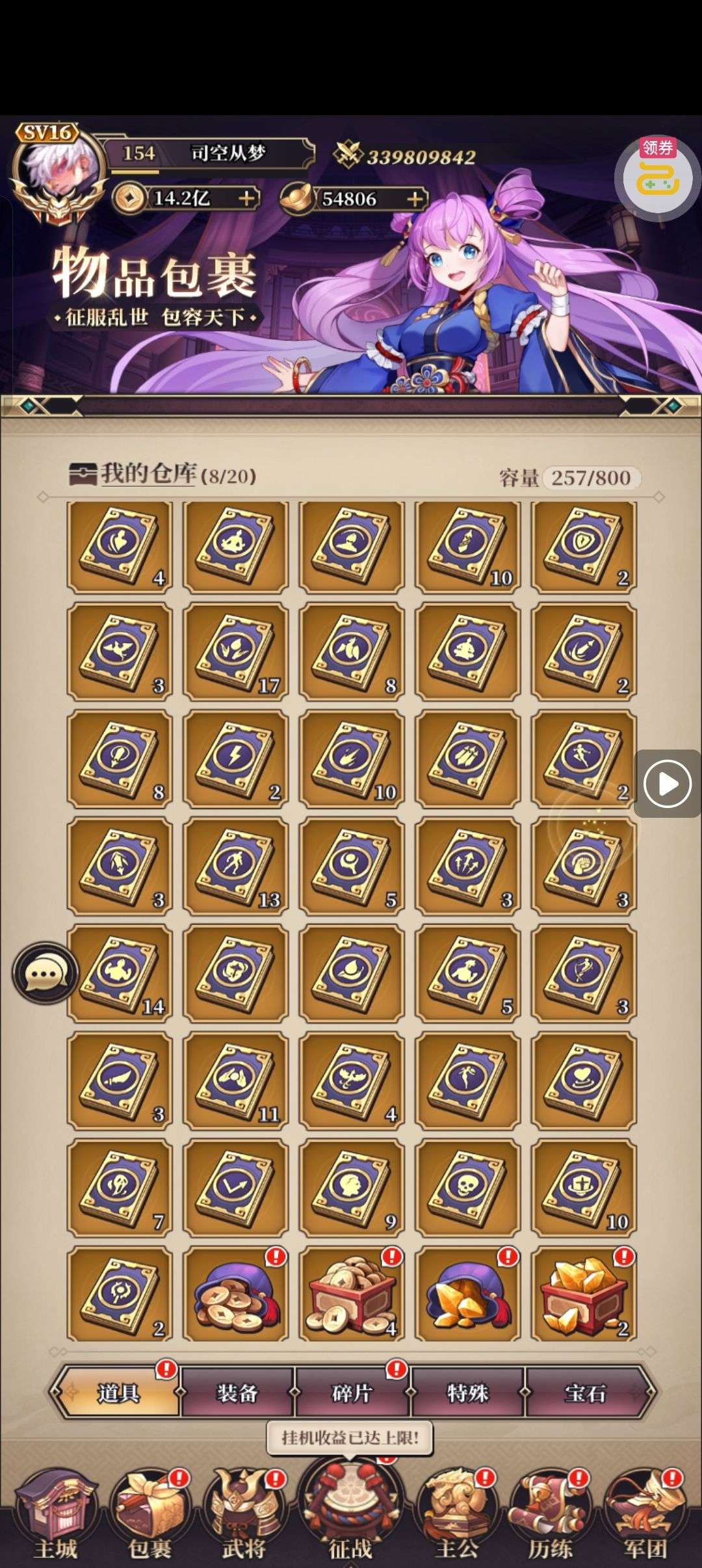 资源超多,盒子一大堆,可以培养8个17星,李白周瑜已满,还有7万三国币