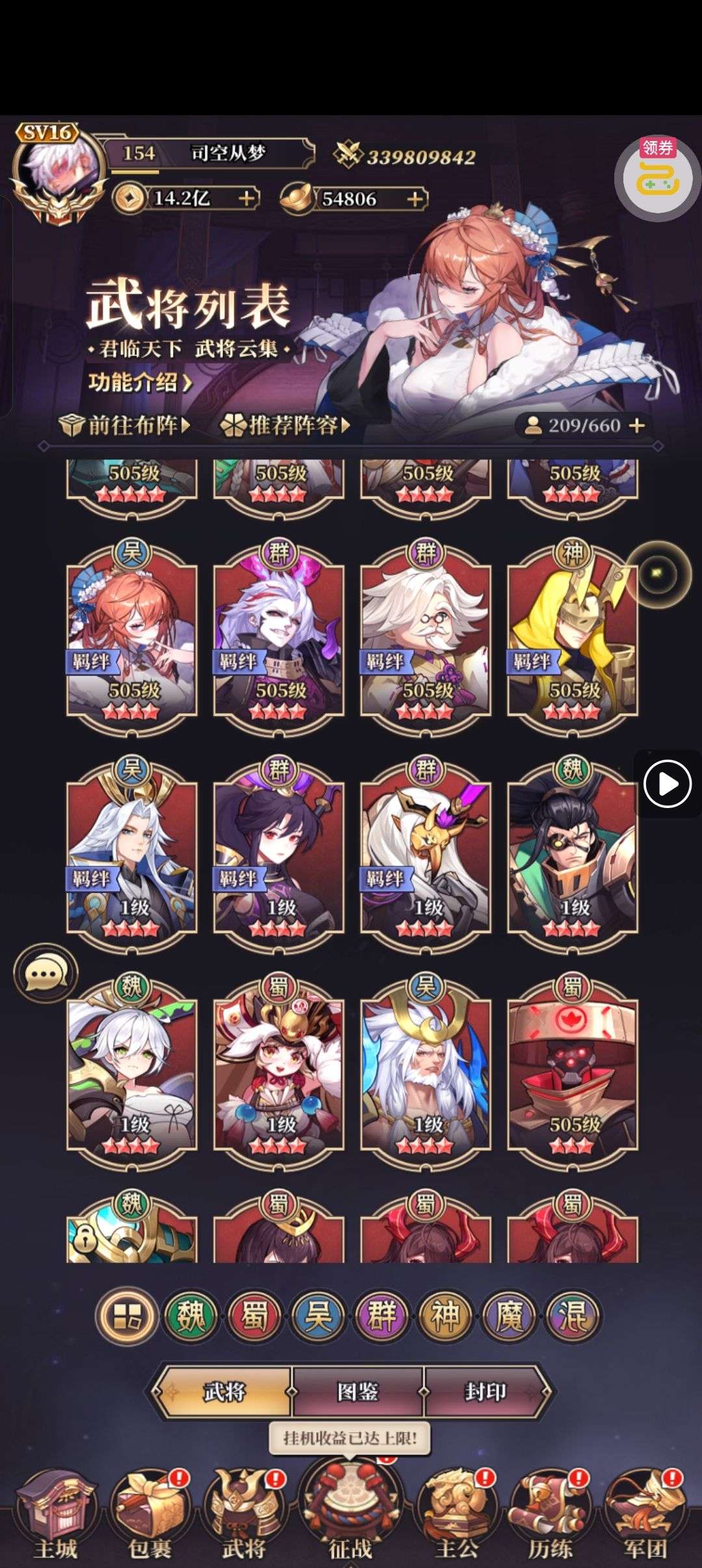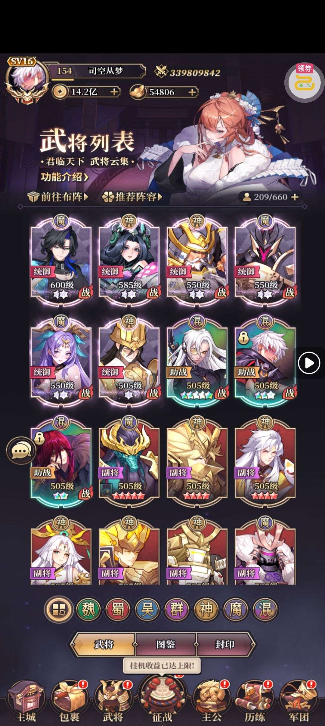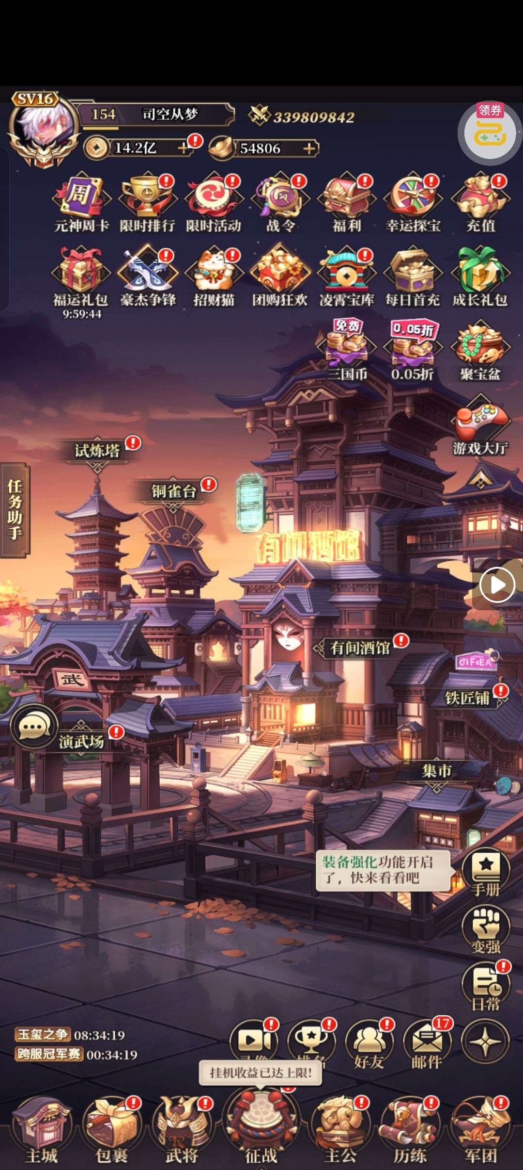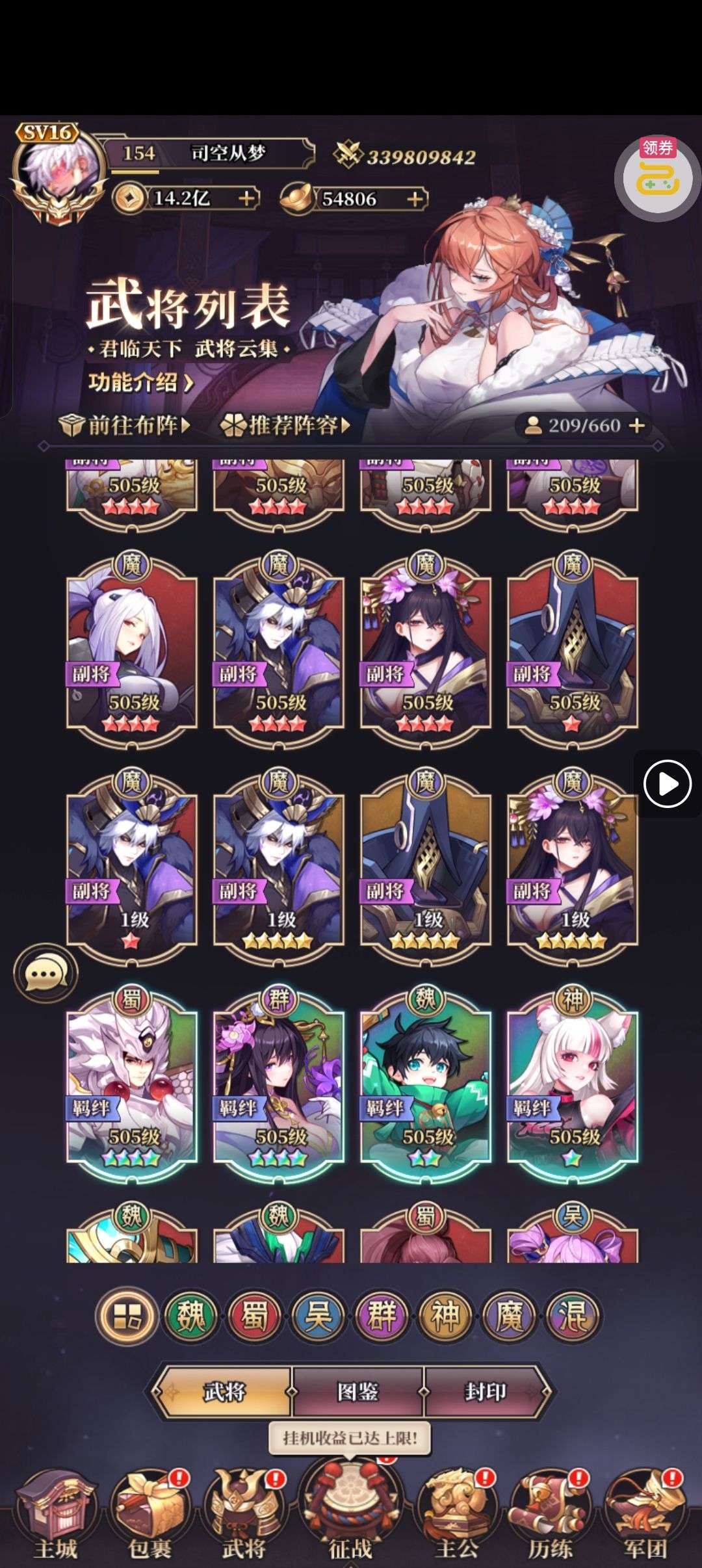 资源超多,盒子一大堆,可以培养8个17星,李白周瑜已满,还有7万三国币