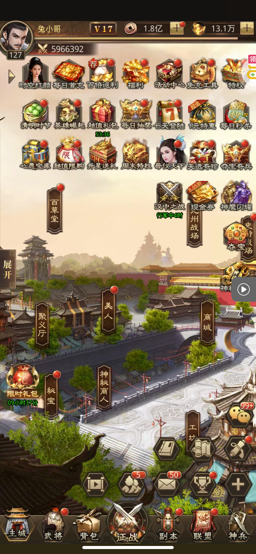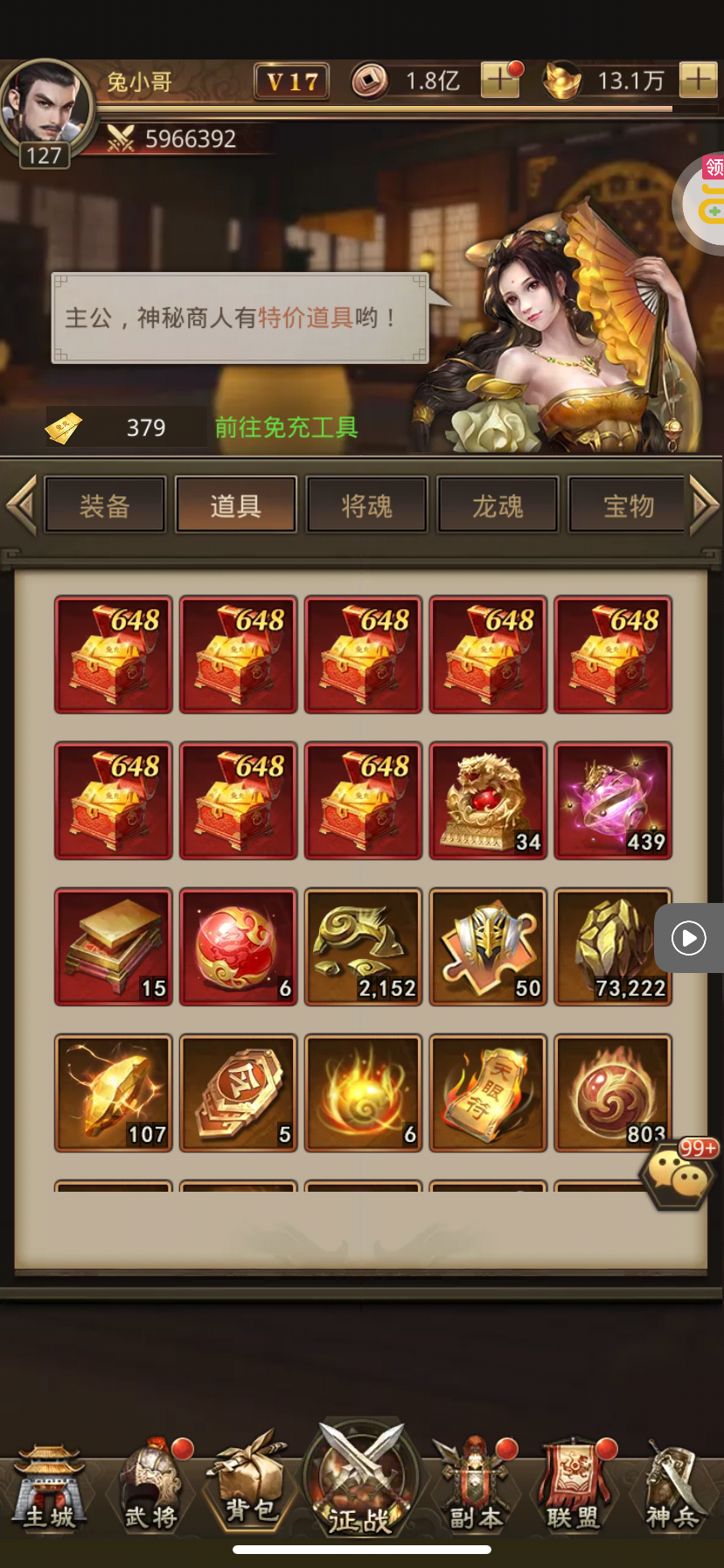 夺宝券*1、比武令*1、5星随机将魂*10(每个账号限领一次)
