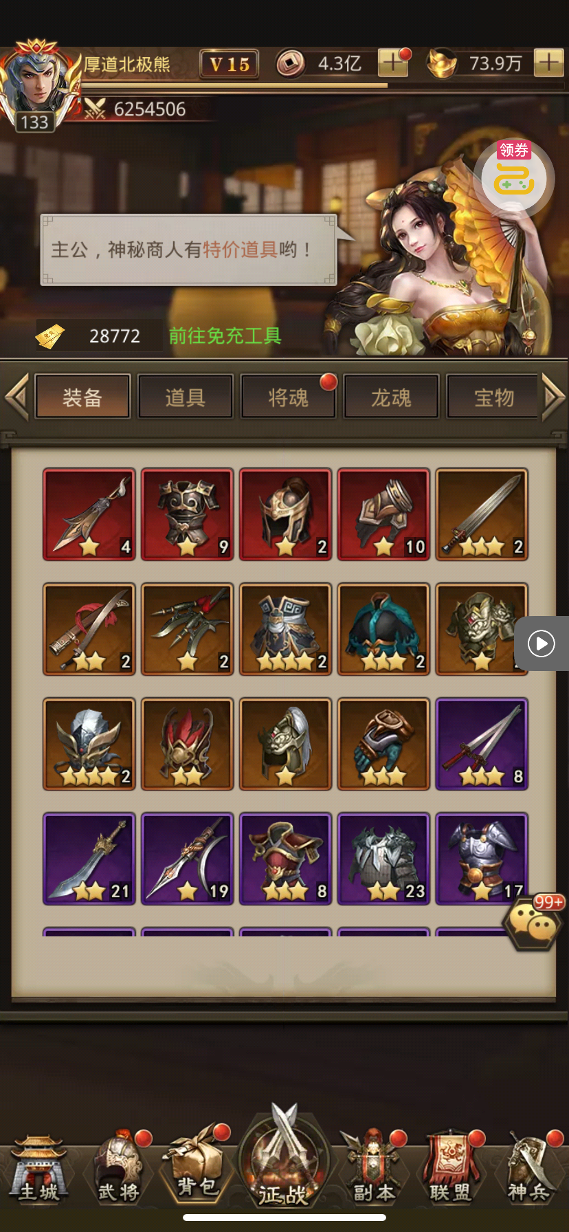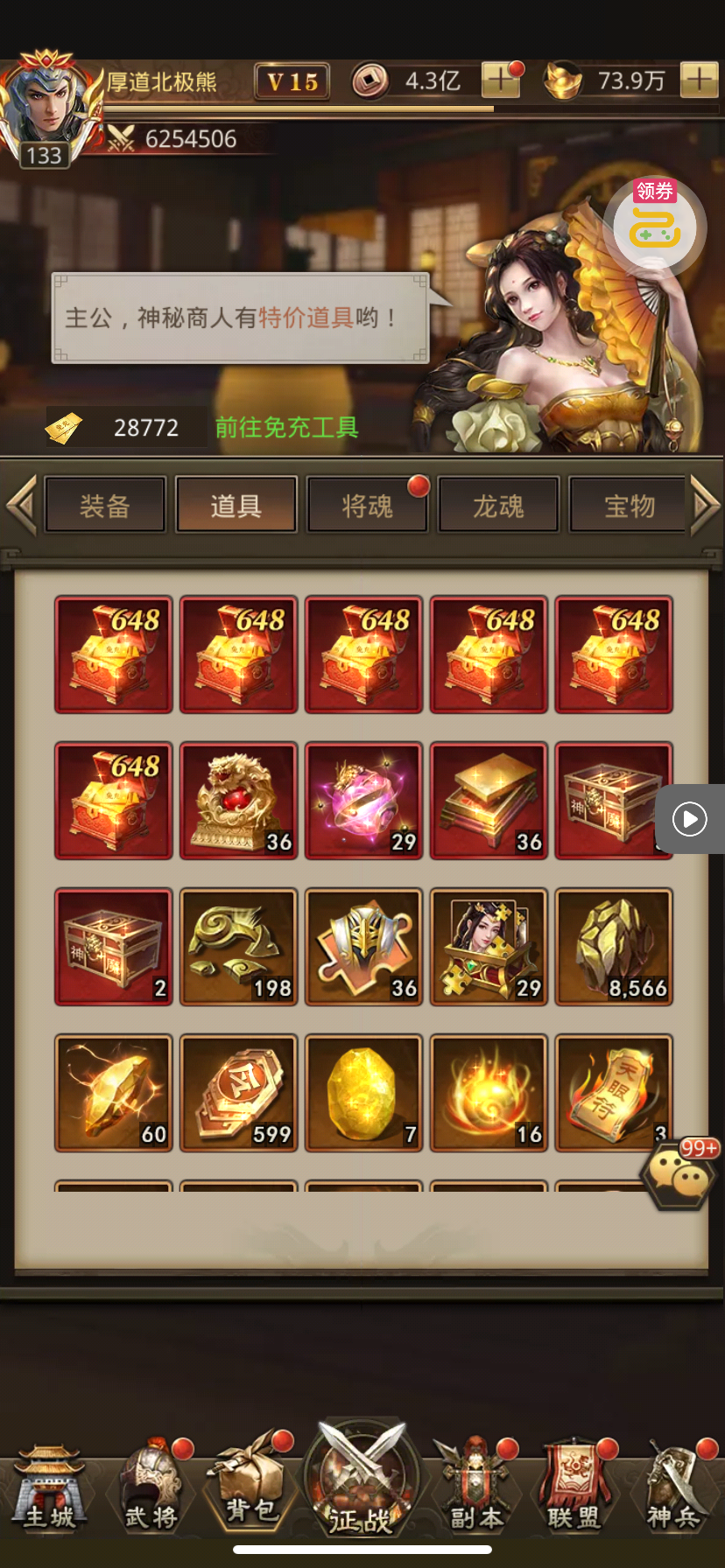 夺宝券*1、比武令*1、5星随机将魂*10(每个账号限领一次)