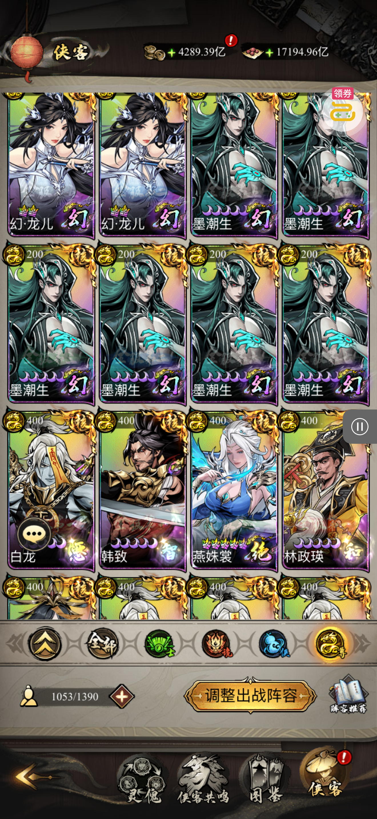 30张648真充卡豪礼、侠客灵丹*10、侠客神丹*10、侠客金丹*1、专属挑战令*1(每个账号限领一次)