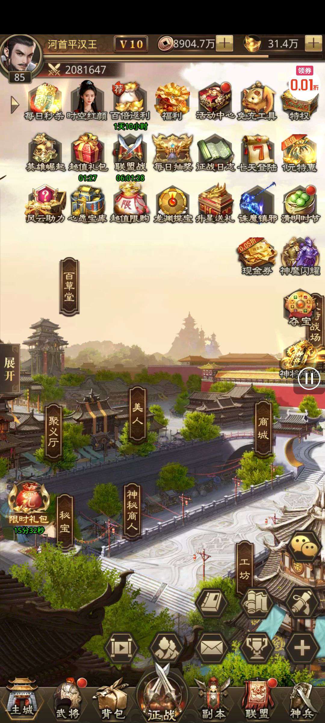 夺宝券*1、比武令*1、5星随机将魂*10(每个账号限领一次)