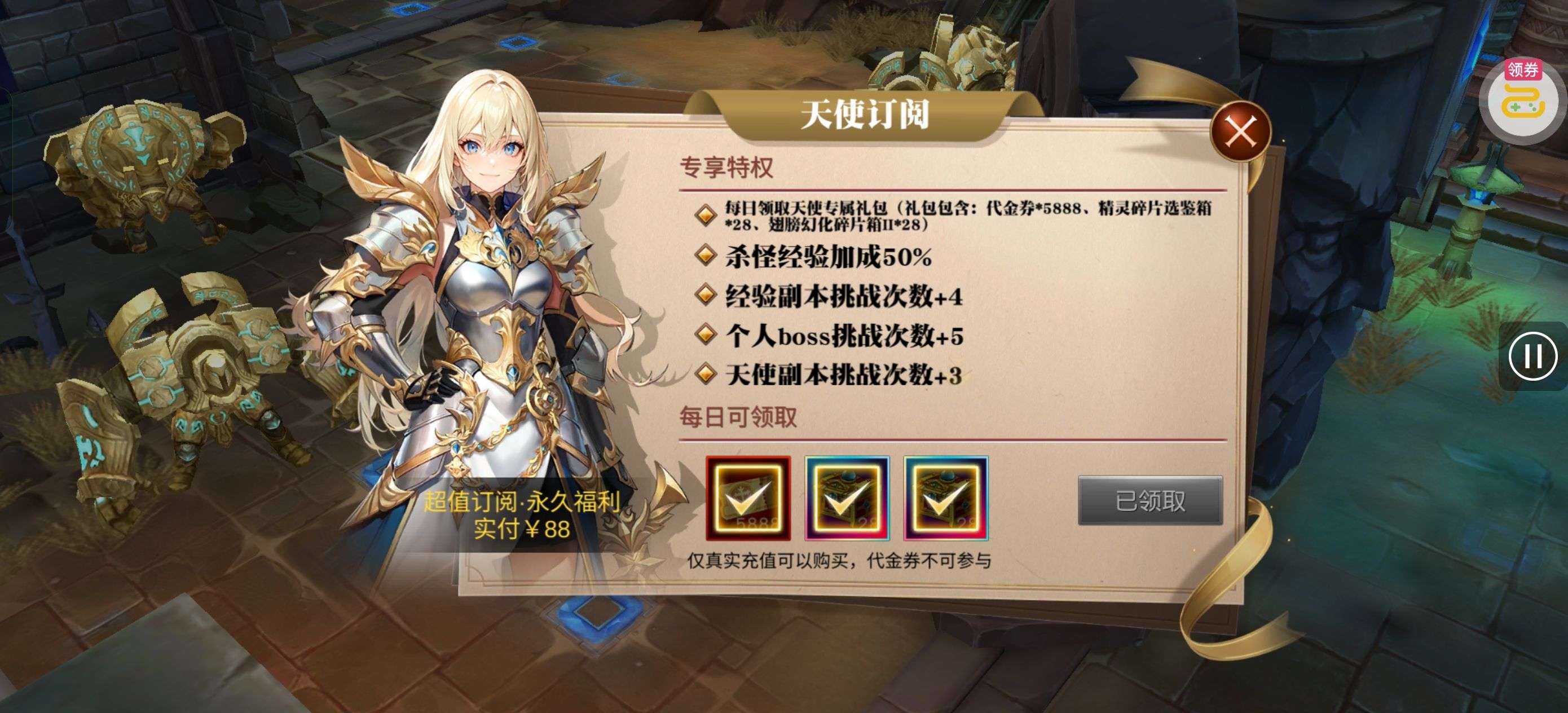 30张648真充卡豪礼、侠客灵丹*10、侠客神丹*10、侠客金丹*1、专属挑战令*1(每个账号限领一次)
