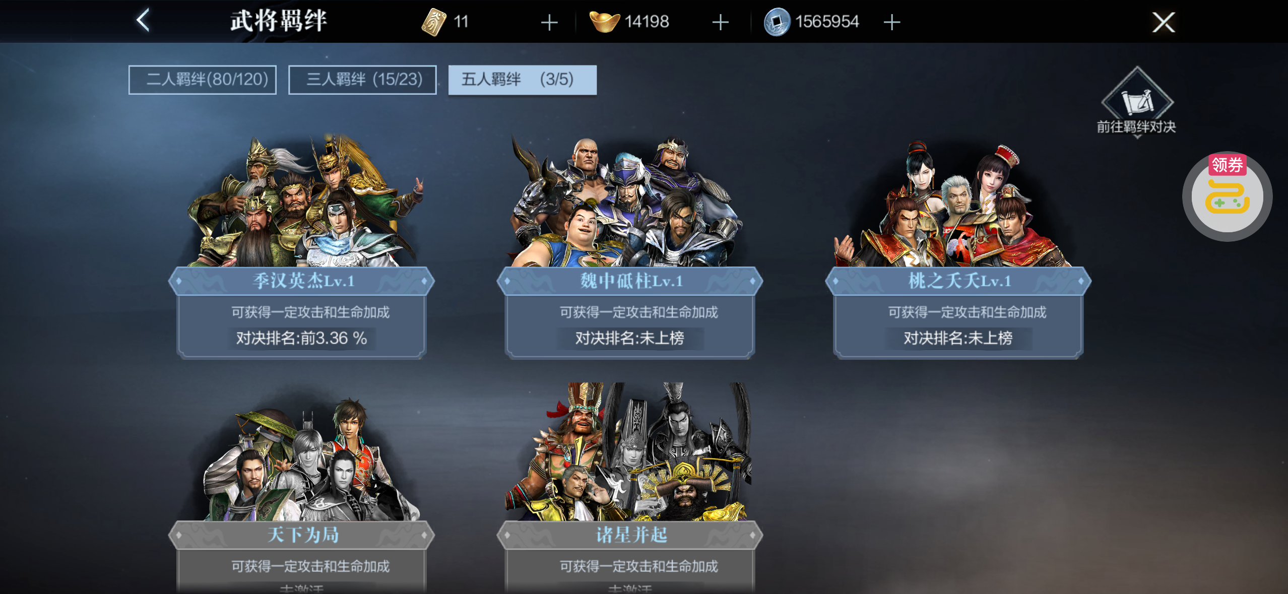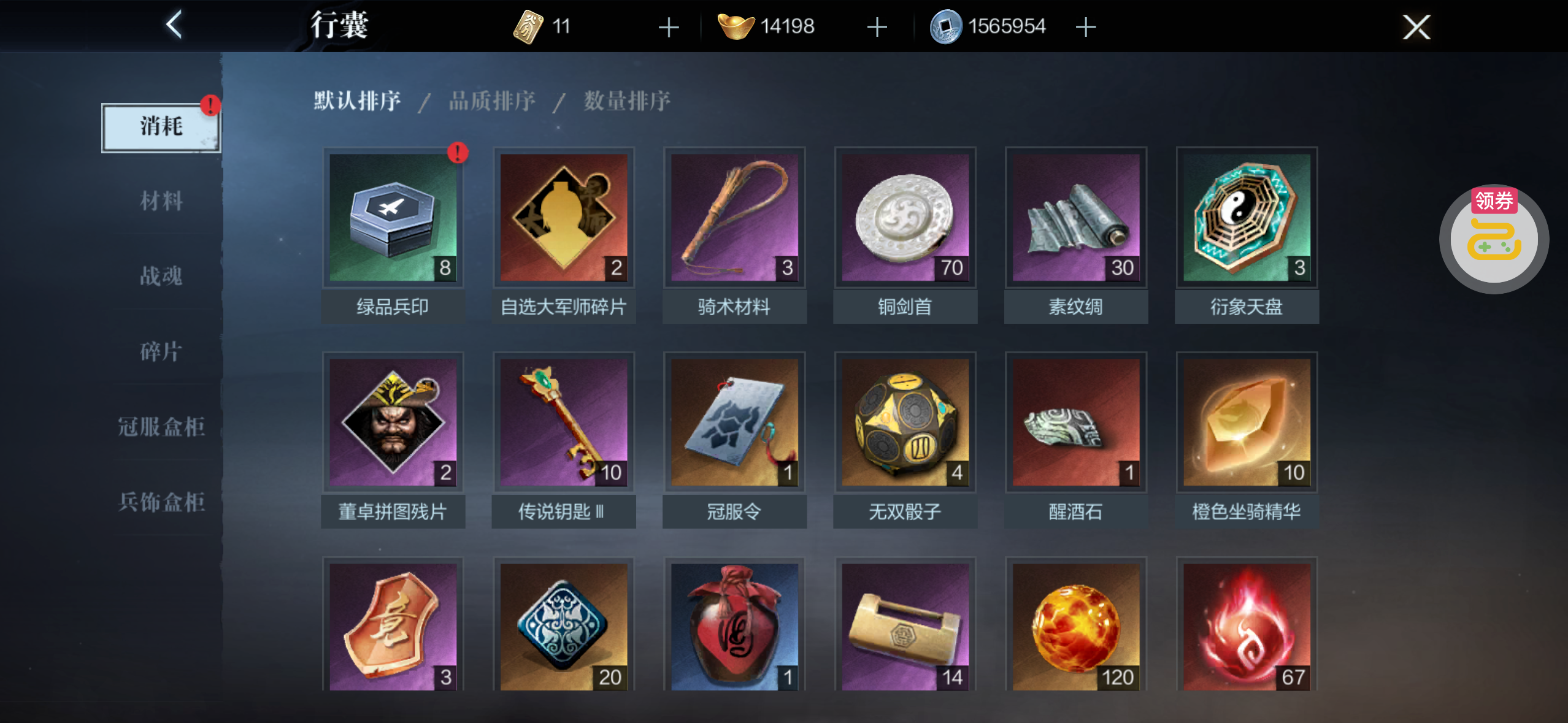 夺宝券*1、比武令*1、5星随机将魂*10(每个账号限领一次)