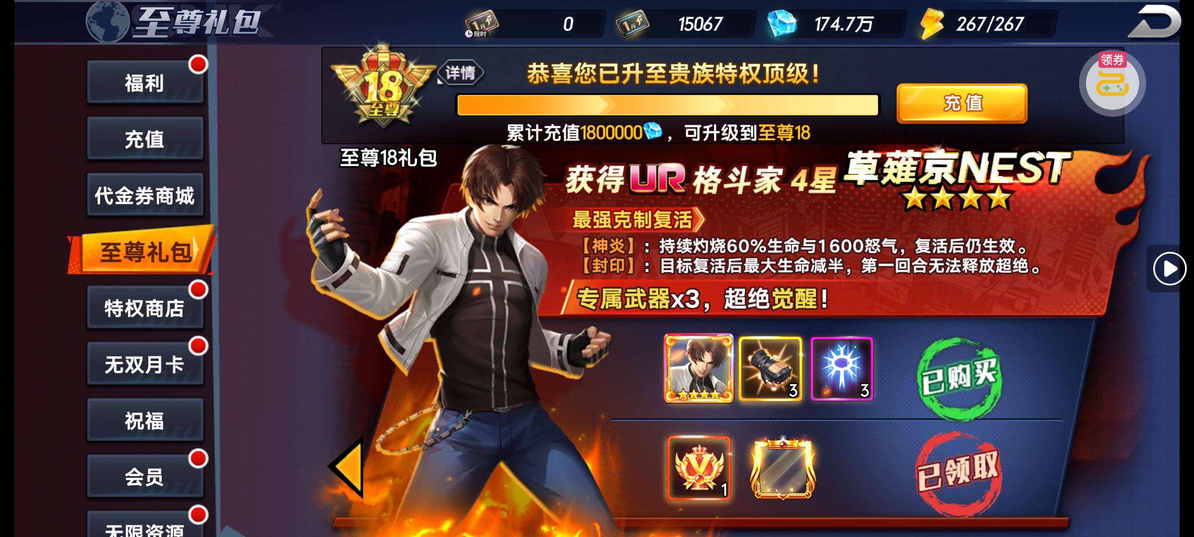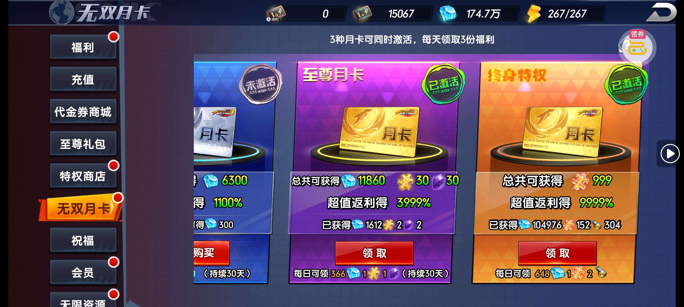 30张648真充卡豪礼、侠客灵丹*10、侠客神丹*10、侠客金丹*1、专属挑战令*1(每个账号限领一次)