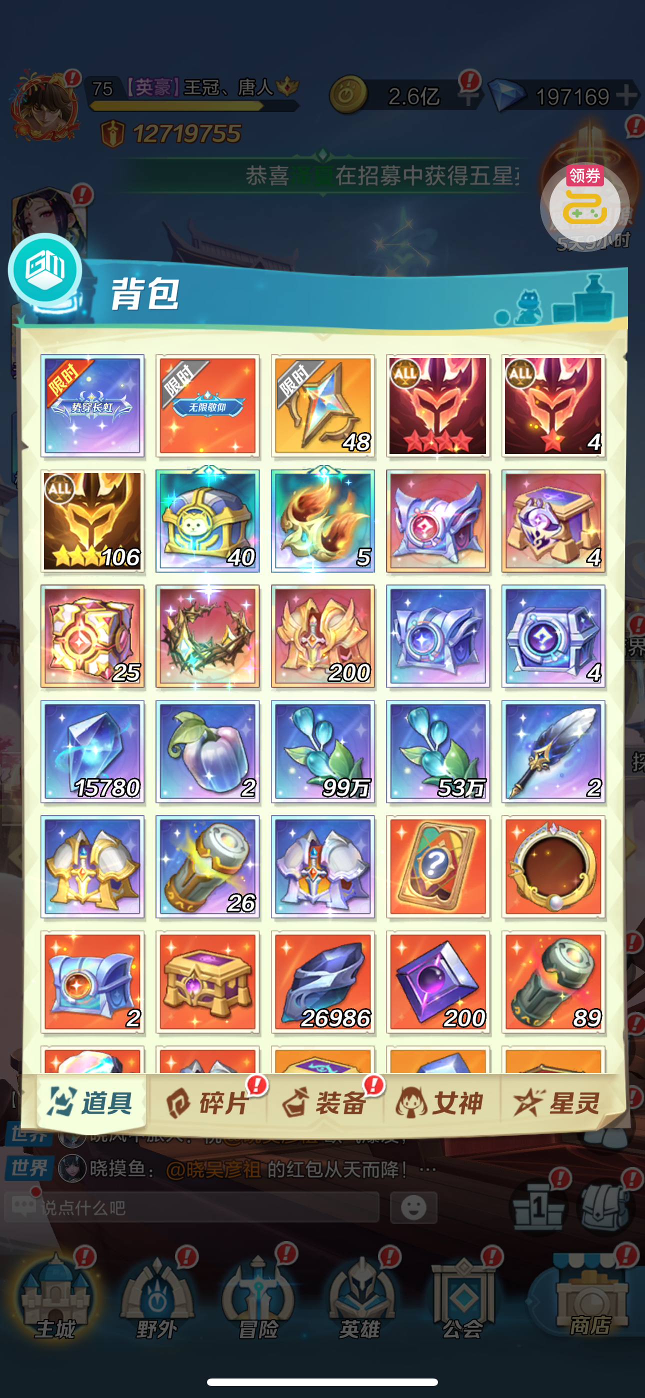 夺宝券*1、比武令*1、5星随机将魂*10(每个账号限领一次)