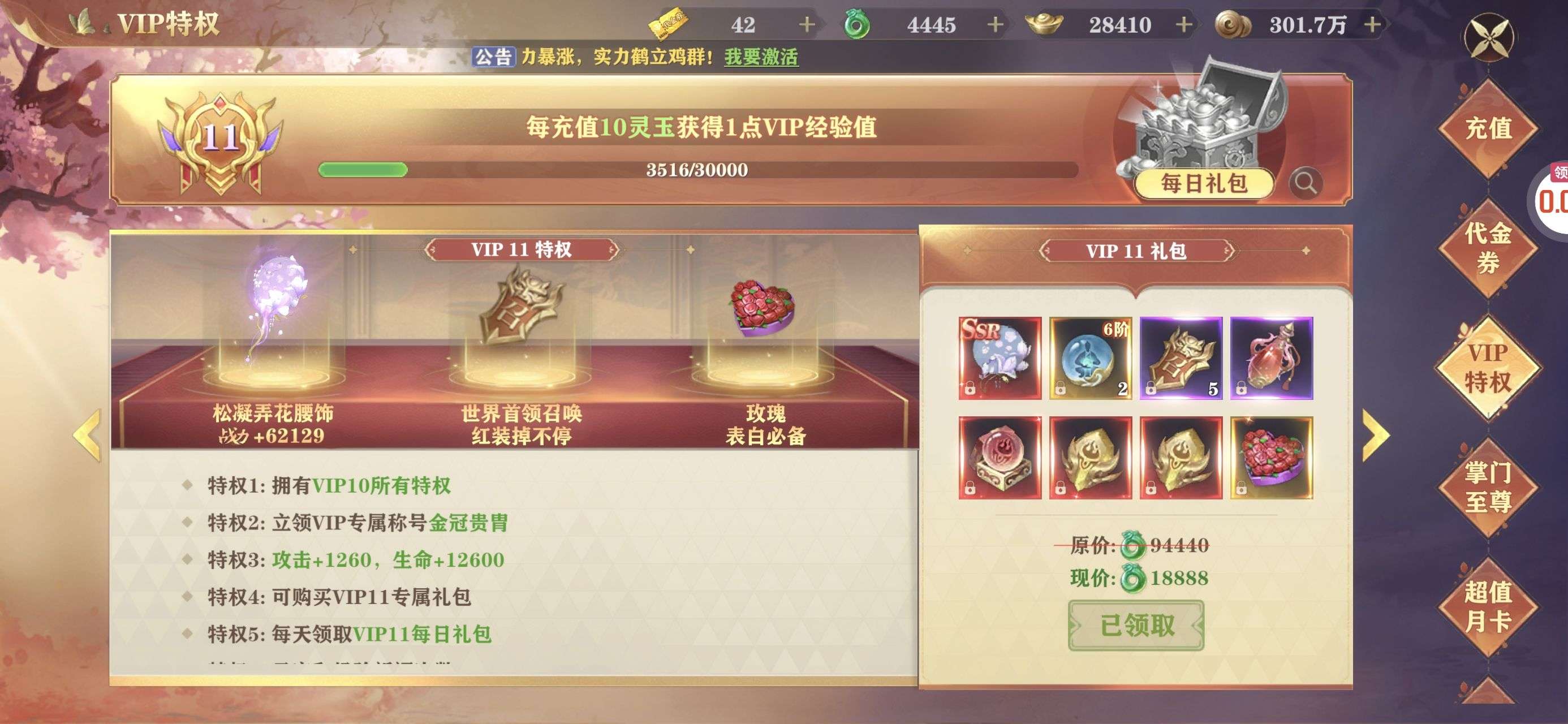 30张648真充卡豪礼、侠客灵丹*10、侠客神丹*10、侠客金丹*1、专属挑战令*1(每个账号限领一次)