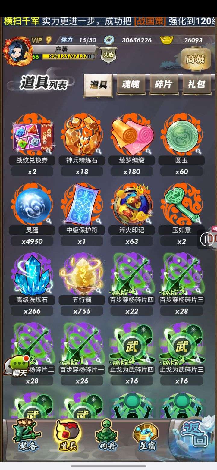 巅峰强势角色收集 还有两万多元宝可用 200多天月卡 材料还有很多 有两个橙色装备自选没开 v9等级 随便接受