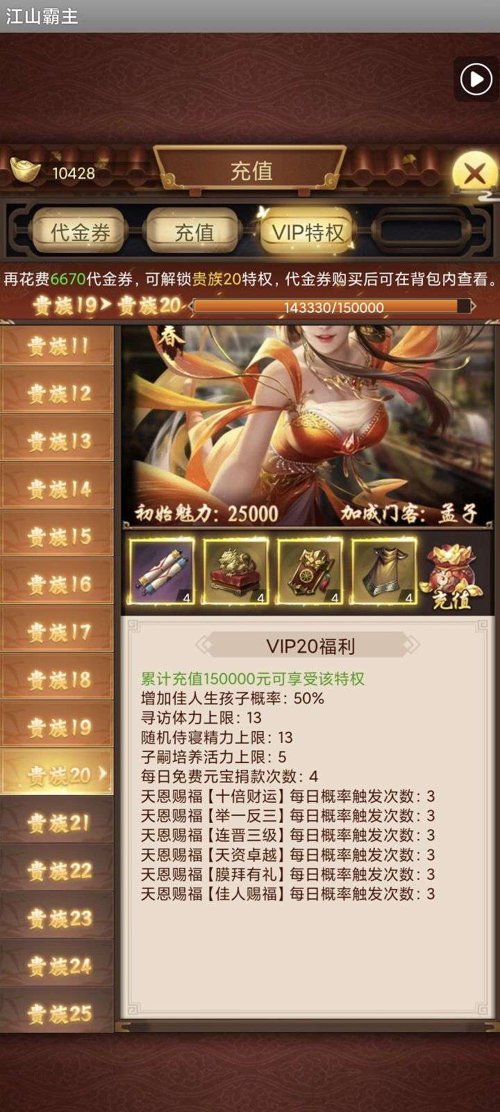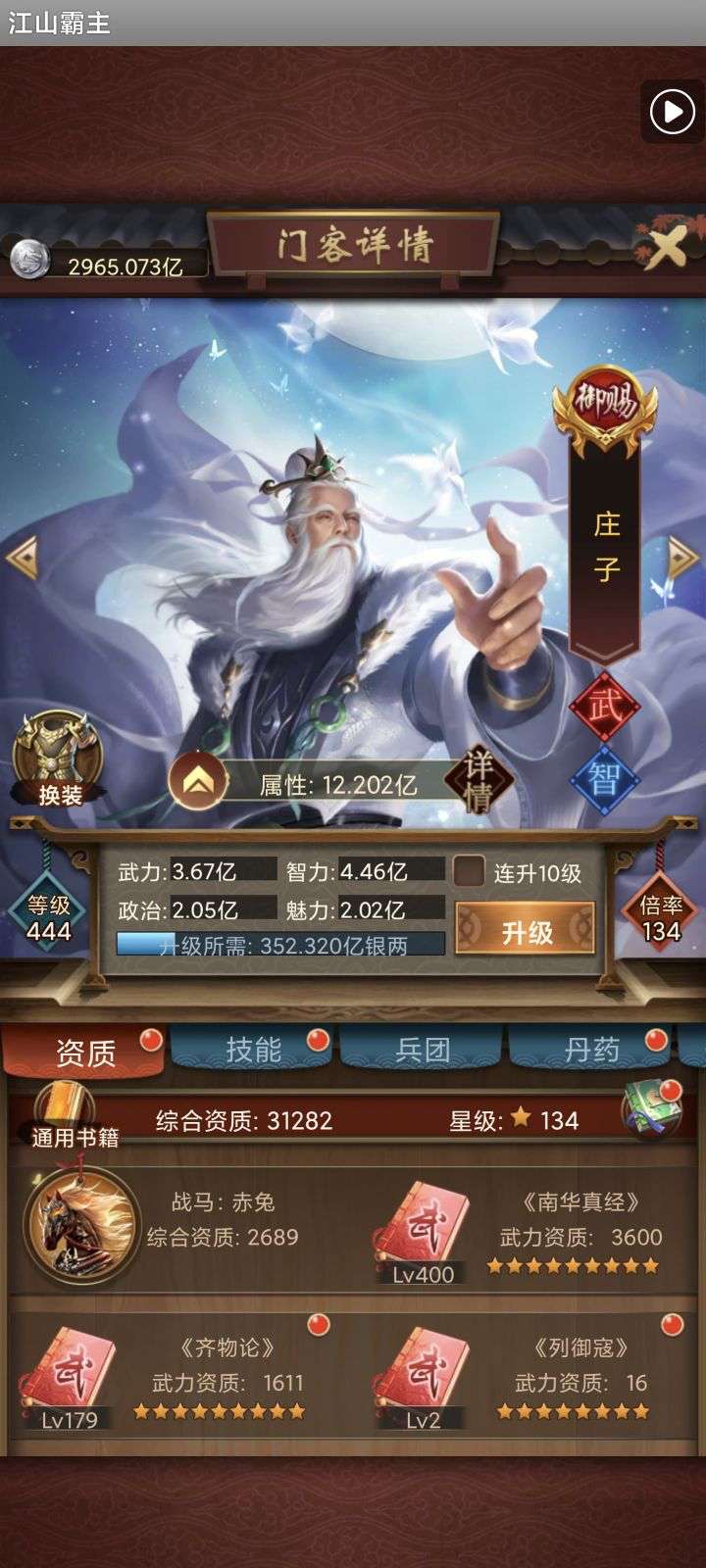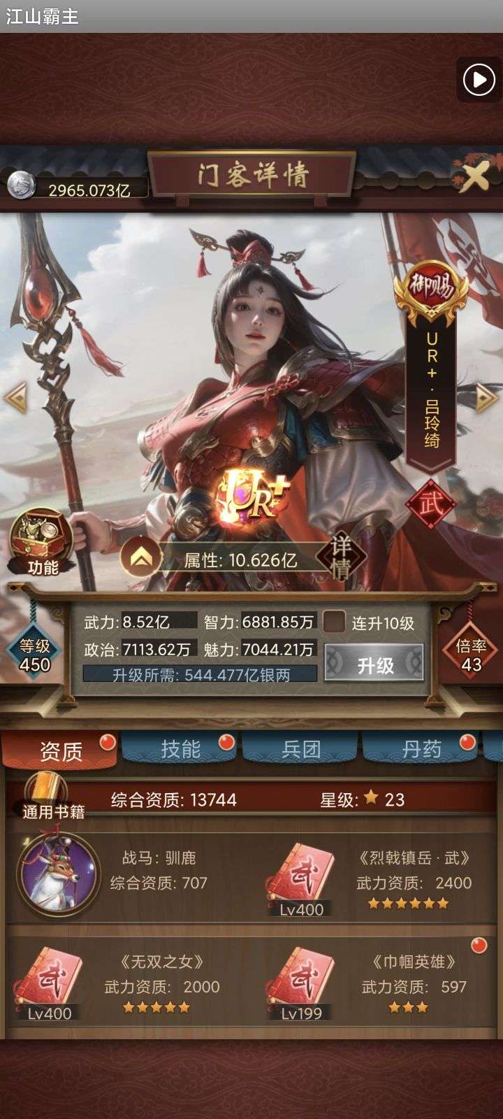 135亿战力。天神将+up将,主妃22w,VIP23。黄金阵容,资源库看图
