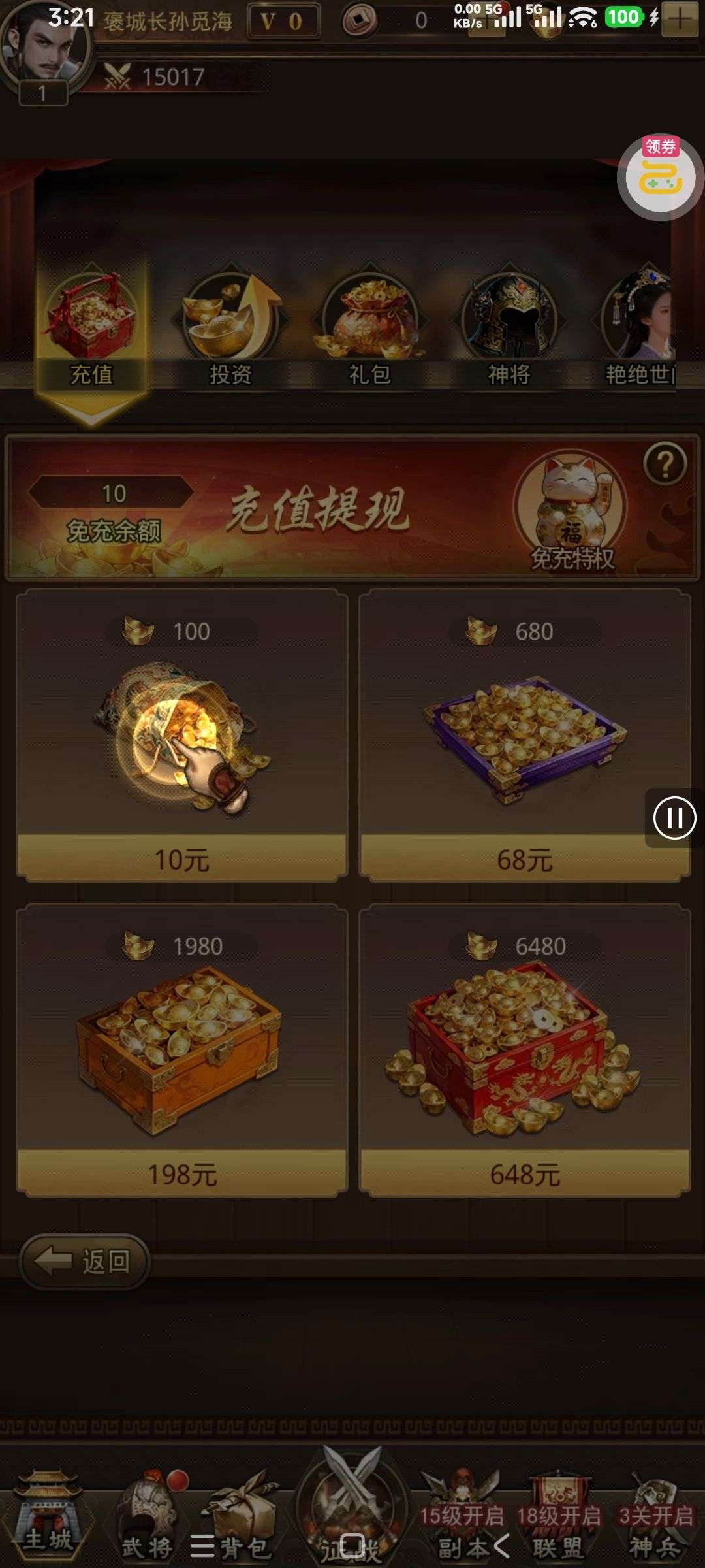 夺宝券*1、比武令*1、5星随机将魂*10(每个账号限领一次)