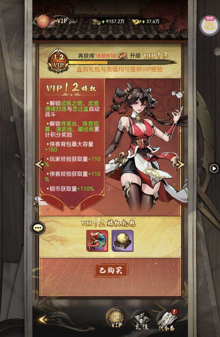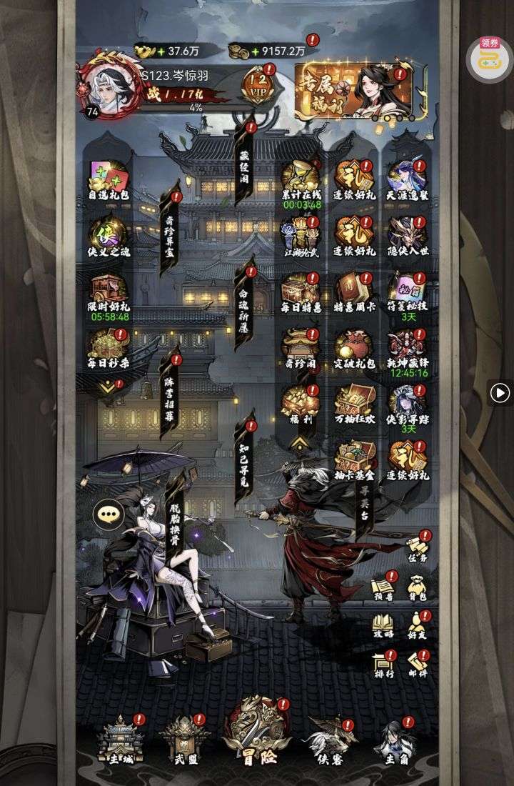 30张648真充卡豪礼、侠客灵丹*10、侠客神丹*10、侠客金丹*1、专属挑战令*1(每个账号限领一次)