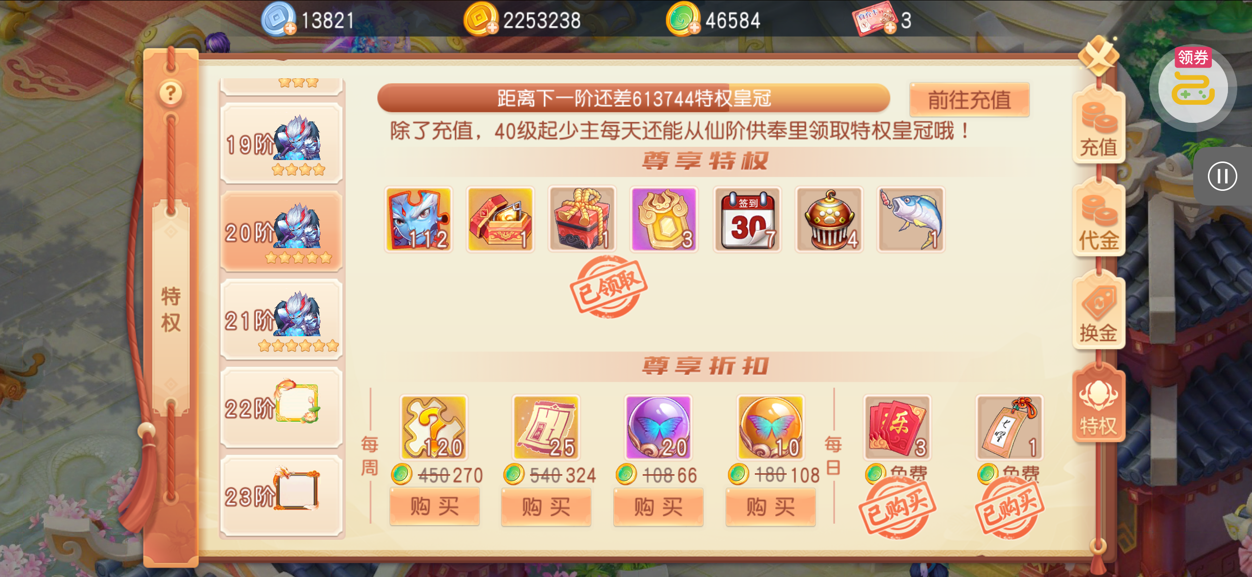 30张648真充卡豪礼、侠客灵丹*10、侠客神丹*10、侠客金丹*1、专属挑战令*1(每个账号限领一次)