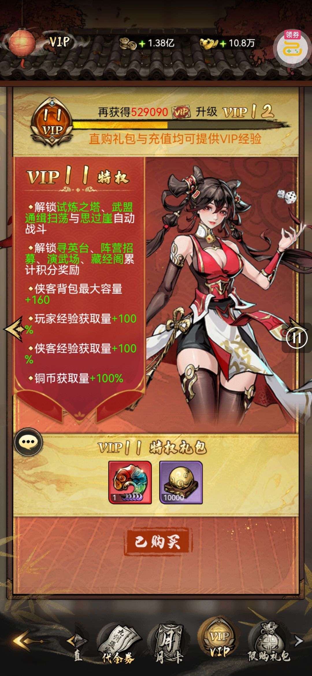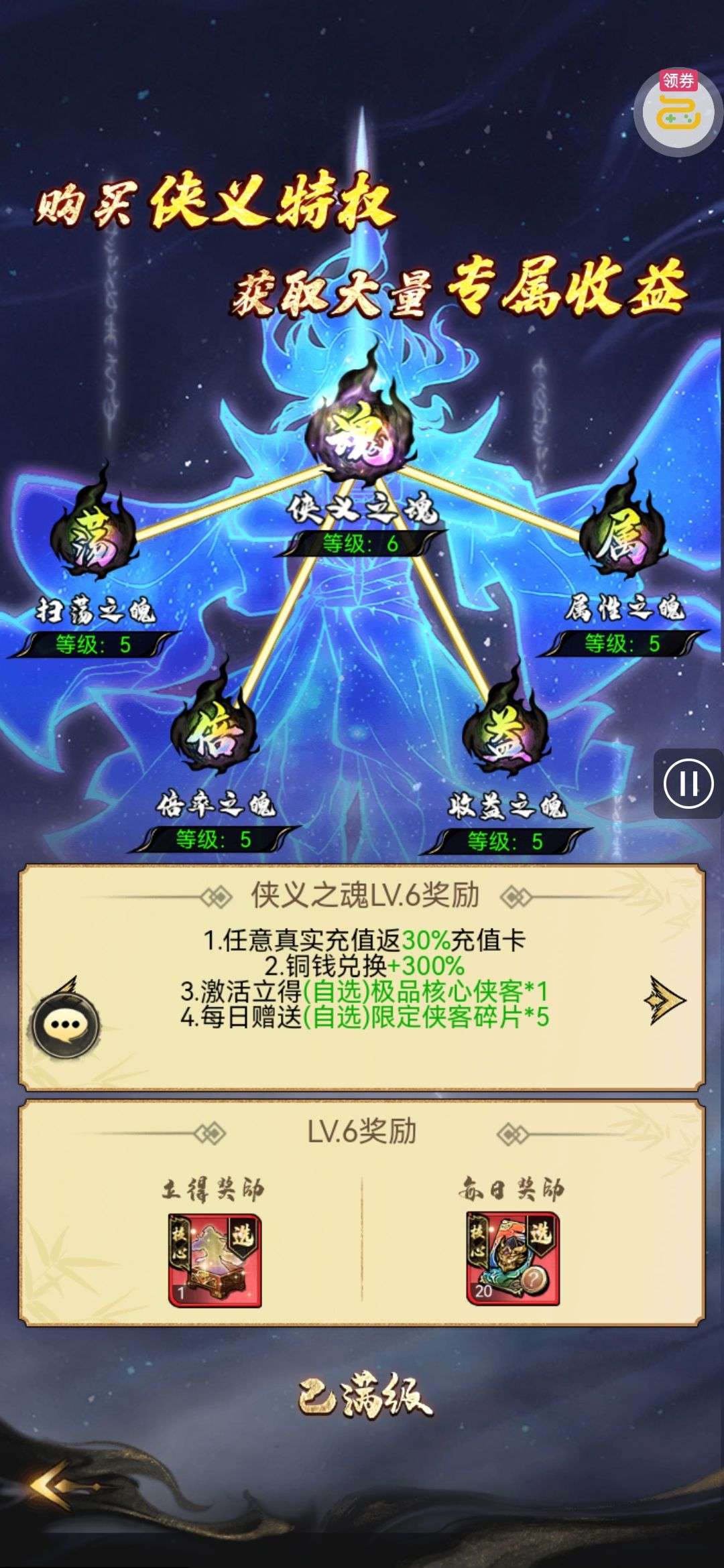 30张648真充卡豪礼、侠客灵丹*10、侠客神丹*10、侠客金丹*1、专属挑战令*1(每个账号限领一次)